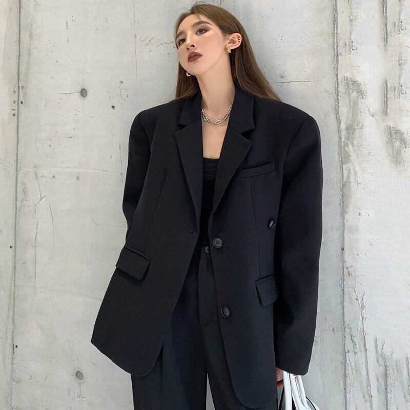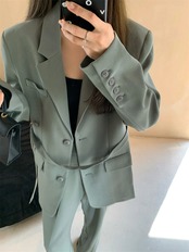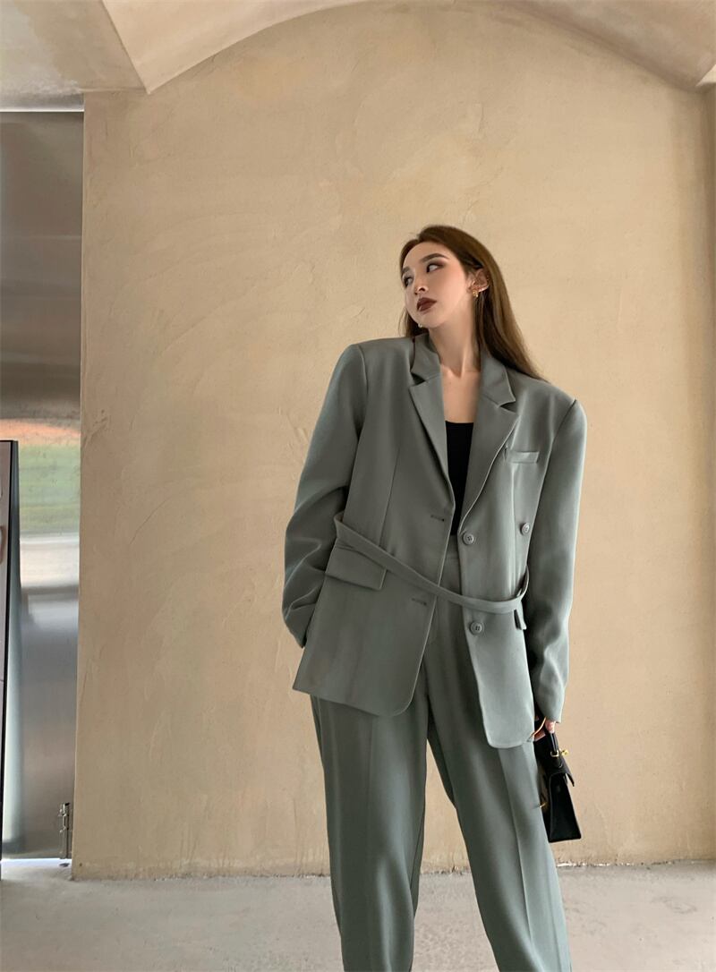 色:グレーグリーンのコート,黒いジャケット,グレーグリーンパンツ,黒いズボン