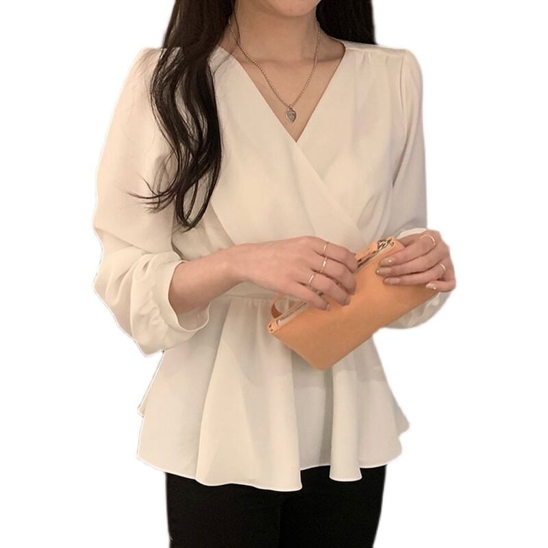 韓国ファッションNEWスプリングスタンダードVネックパフスリーブスリーブウェスト薄手シャツ トップス ロング レトロ エレガント 春物 長袖 ウエスト muzly48178262262 | Neatly