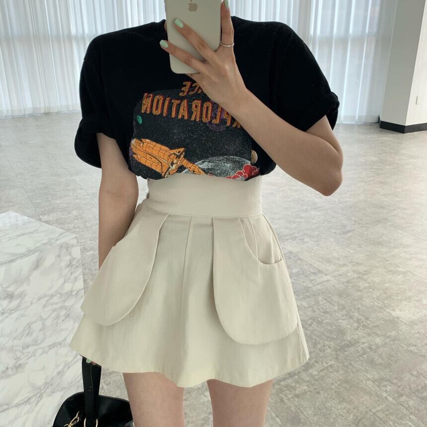 韓国ファッションNEW夏服ベーシックラウンドネックTシャツハイウェストウェストプリーツスカート カジュアルポケットショーツ 夏物 Oネック ウエスト muzly36365840866 | Neatly