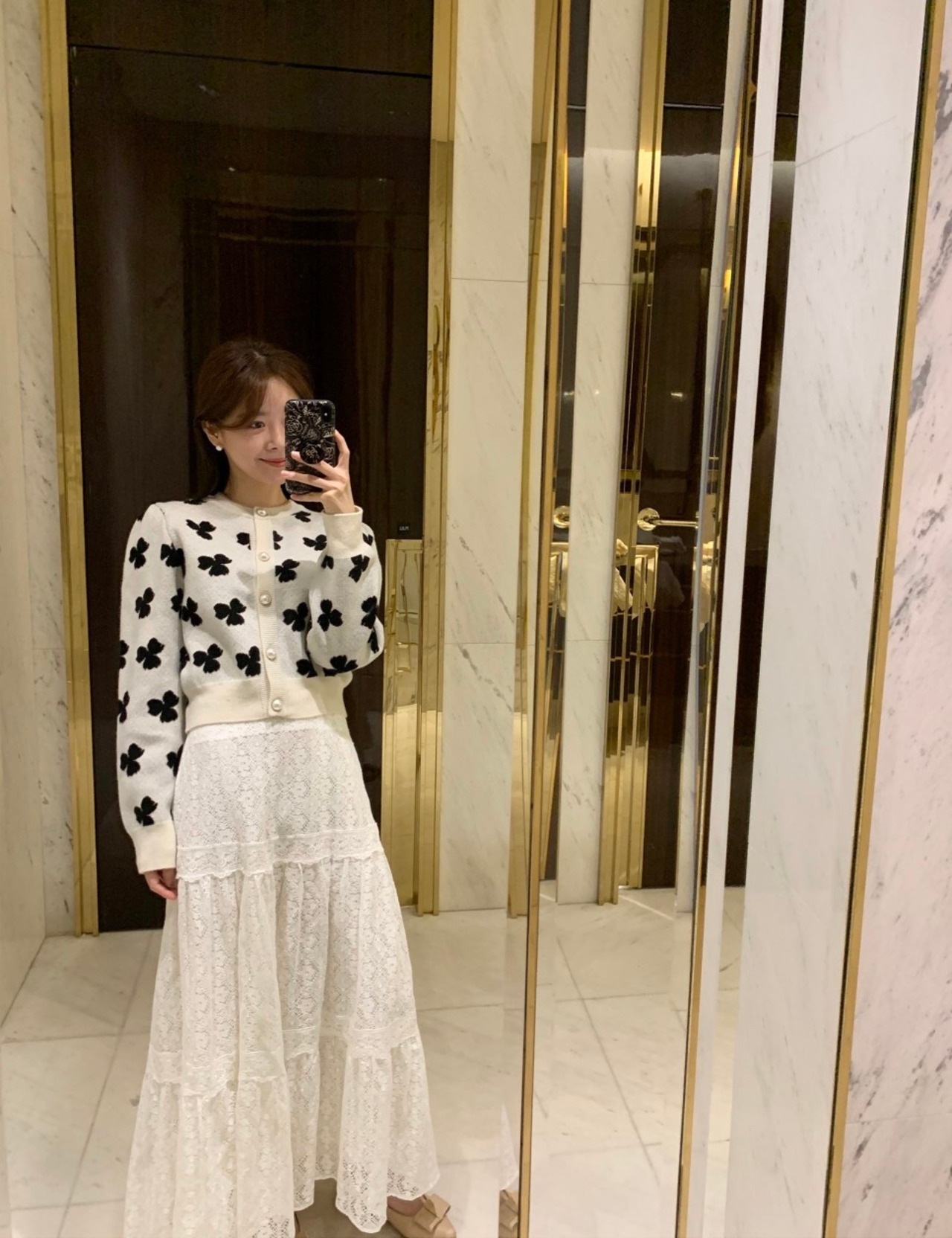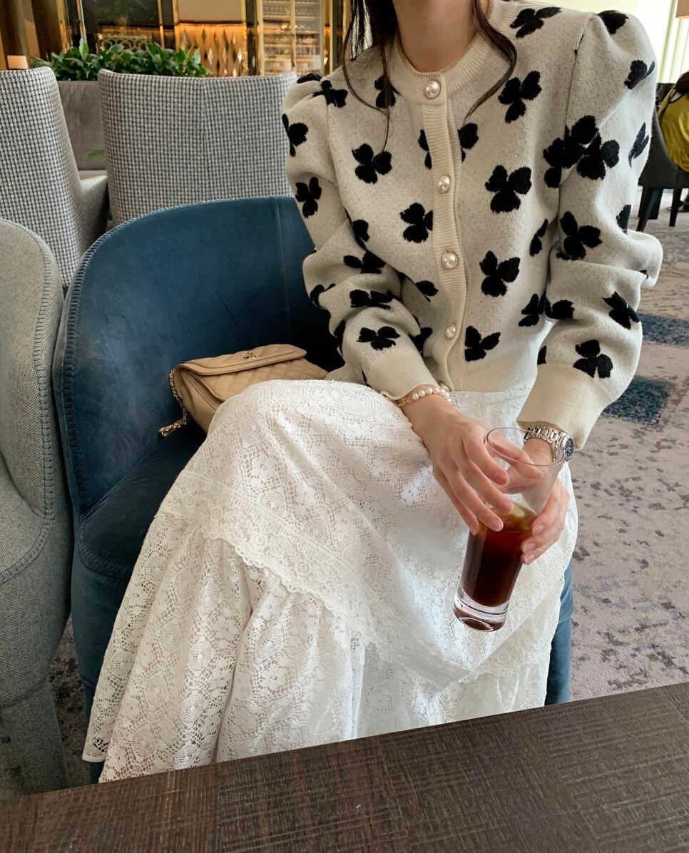 秋物ラウンドネックニットカーディガンFlowerデザイン セーター ジャケット ロング エレガント オータム Oネック パール 真珠 フラワーデザイン 長袖 muzly37508800727 | Neatly