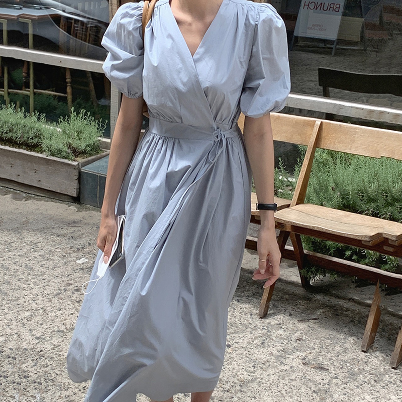 韓国ファッションNEW夏服スタンダードVネックスリーブスカート ロングウェストスリムミニ ワンピースワンピース レトロ レース 夏物 レースアップ ウエスト muzly71478165135 | Neatly