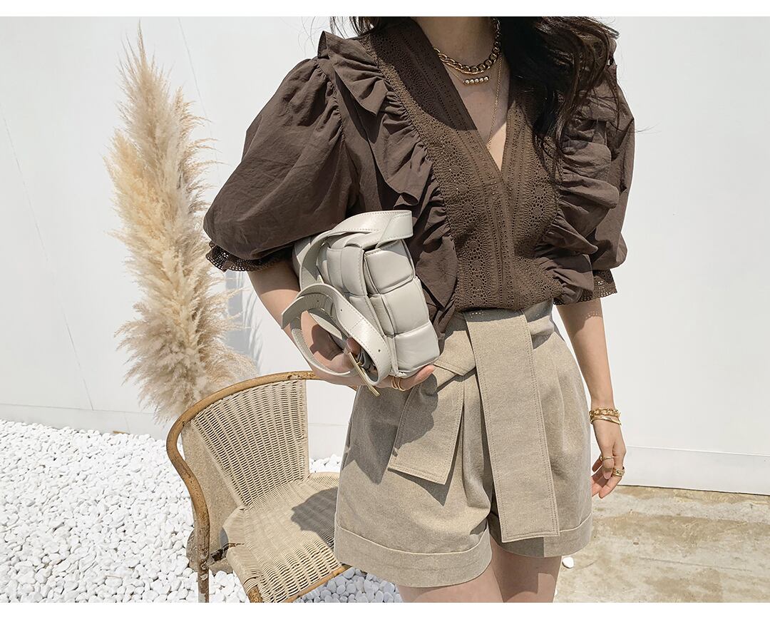 色:白のシャツ,茶色のシャツ,カーキショートパンツ