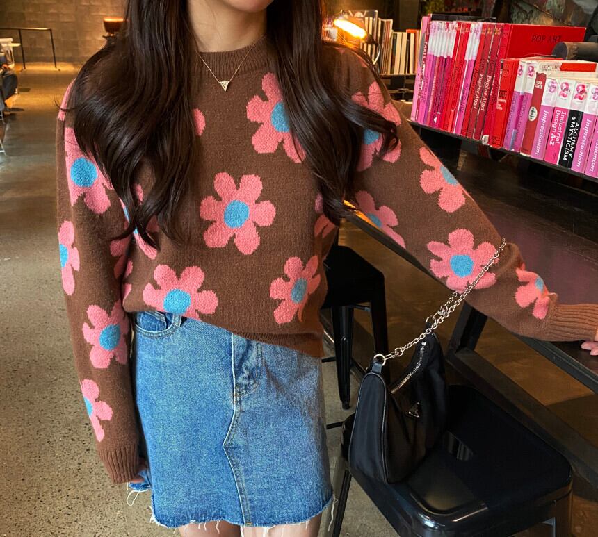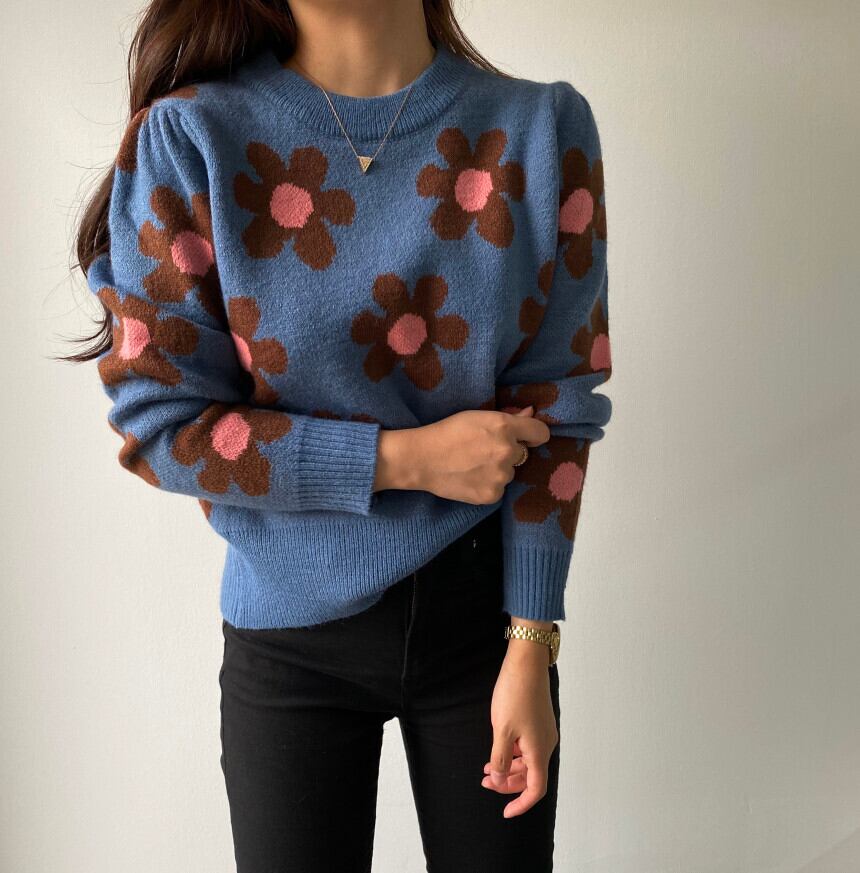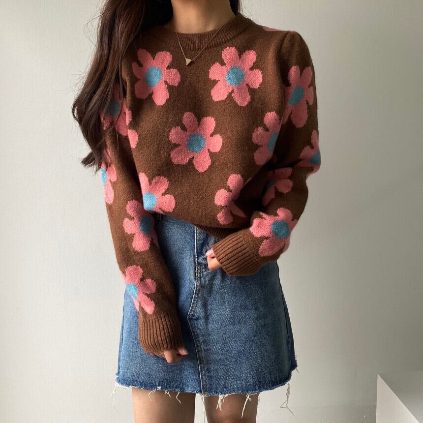 韓国ファッション秋物ウィンタースタンダードラウンドネックルーズ薄手ニットセーター レディース ロング レトロ オータム 冬物 Oネック フラワーデザイン 長袖 muzly47381386245 | Neatly