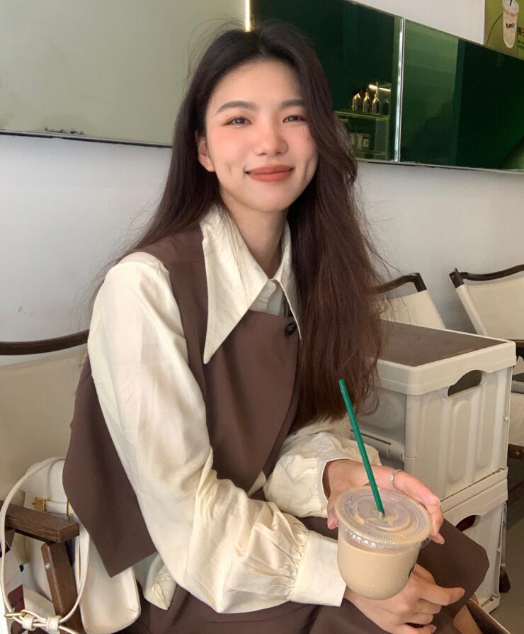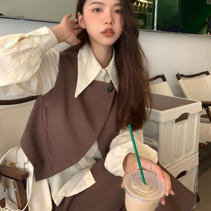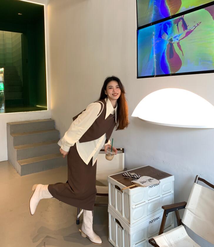 色:黒スカート,コーヒー色のスカート,白いシャツと黒のベスト,アプリコットシャツとコーヒーカラーのベスト