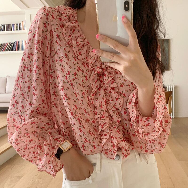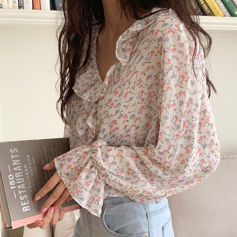 韓国ファッションNEW秋物Vネックフローラルシャツ ルーズトップス レディース ロング 大人ガーリー スウィート キュート カジュアル オータム 花柄 長袖 muzly39821157519 | Neatly