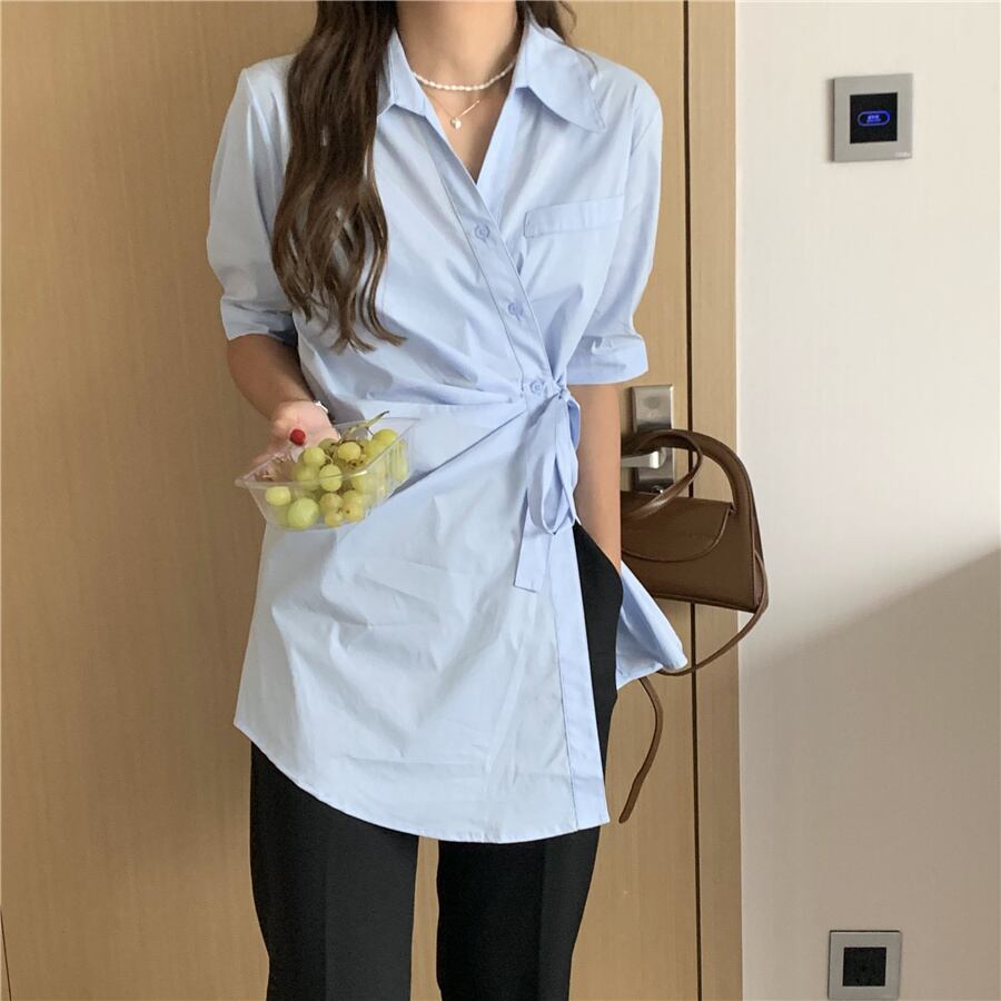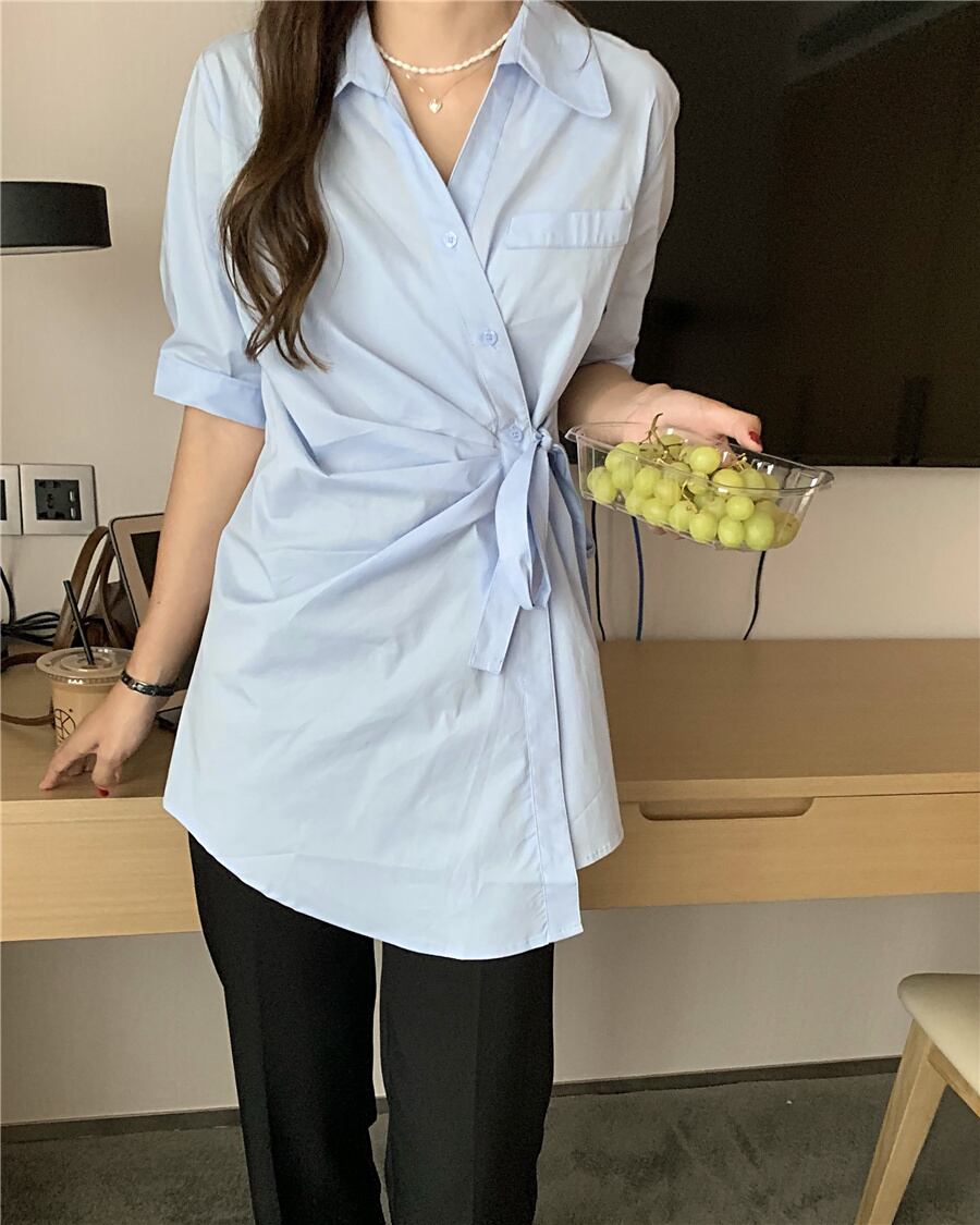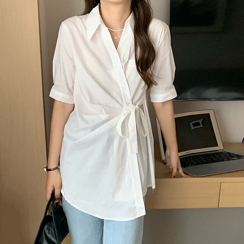 夏服サイドウェストシングルブレストロング半袖スリーブシャツ レディース ショート ハーフスリーブ 夏物 ウエスト muzly94419371410