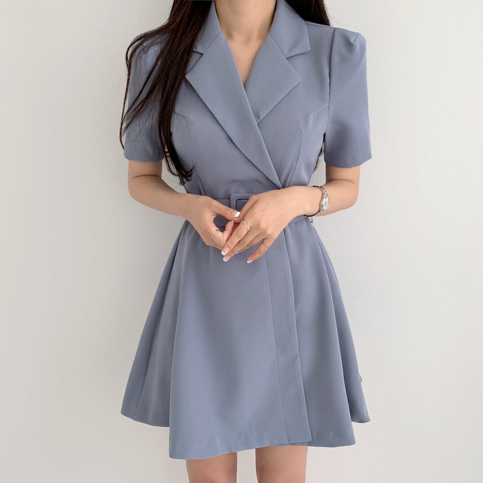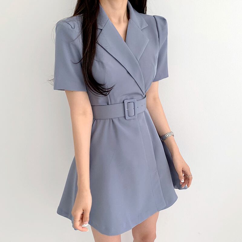 韓国ファッション夏服スタンダードカラーウェスト薄手半袖スリーブワンピース ショート レトロ ハーフスリーブ 夏物 ウエスト muzly80852409272
