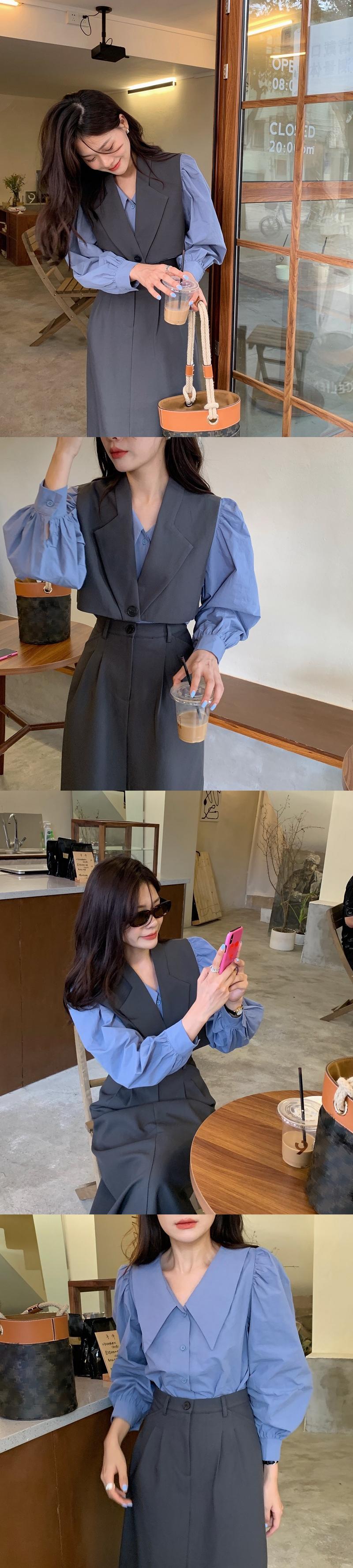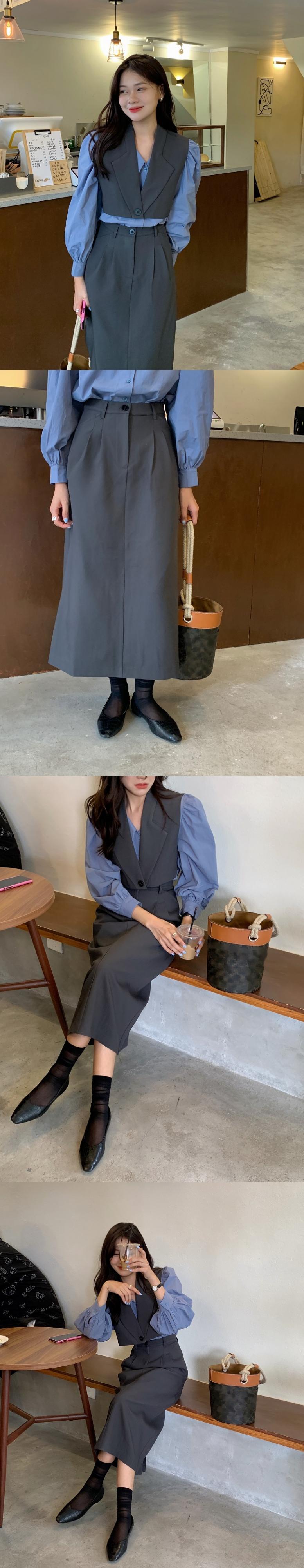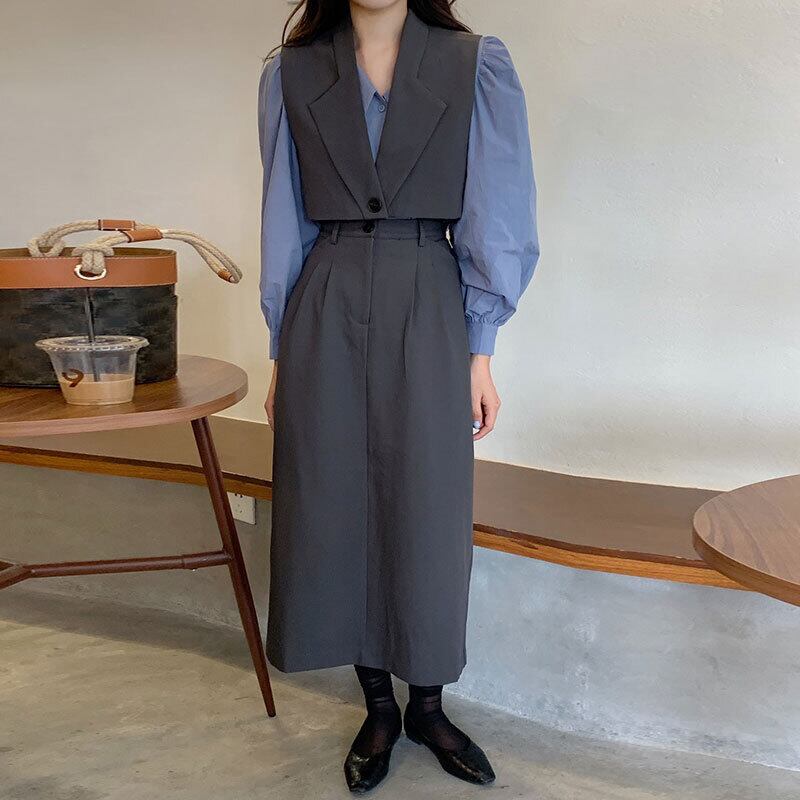 色:カーキ色のシャツ,フォグブルーシャツ,グレーのベスト,ブラウンベスト,グレースカート,茶色のスカート