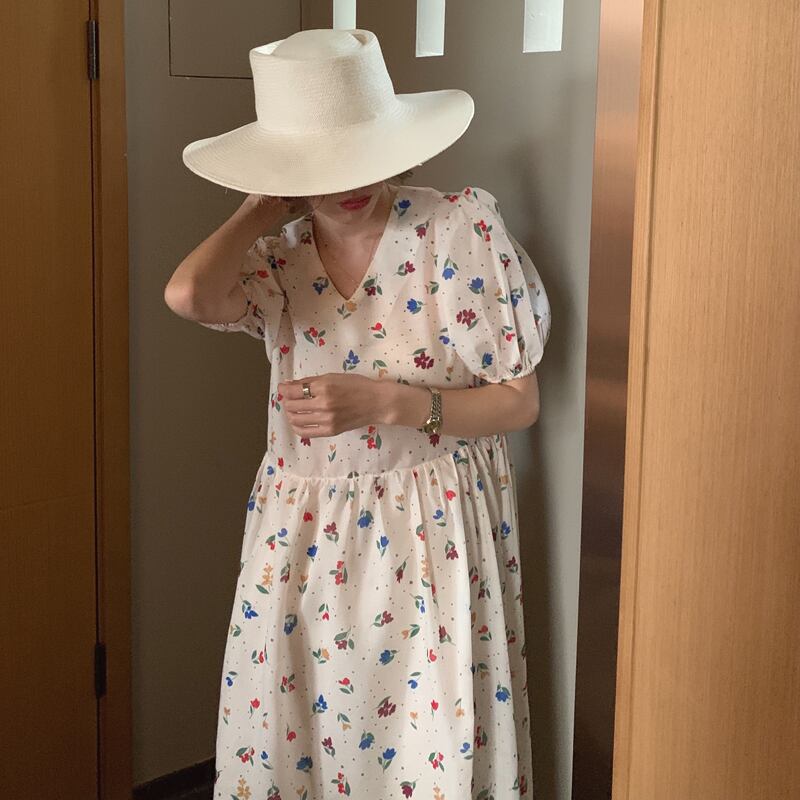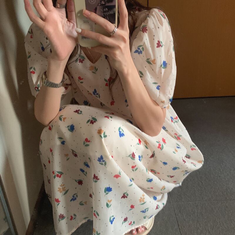 韓国ファッションNEW夏服VネックスリーブFlowerデザイン ロングスカート ウェストスリムミニ ワンピースワンピース 夏物 フラワーデザイン ウエスト muzly64503645435 | Neatly