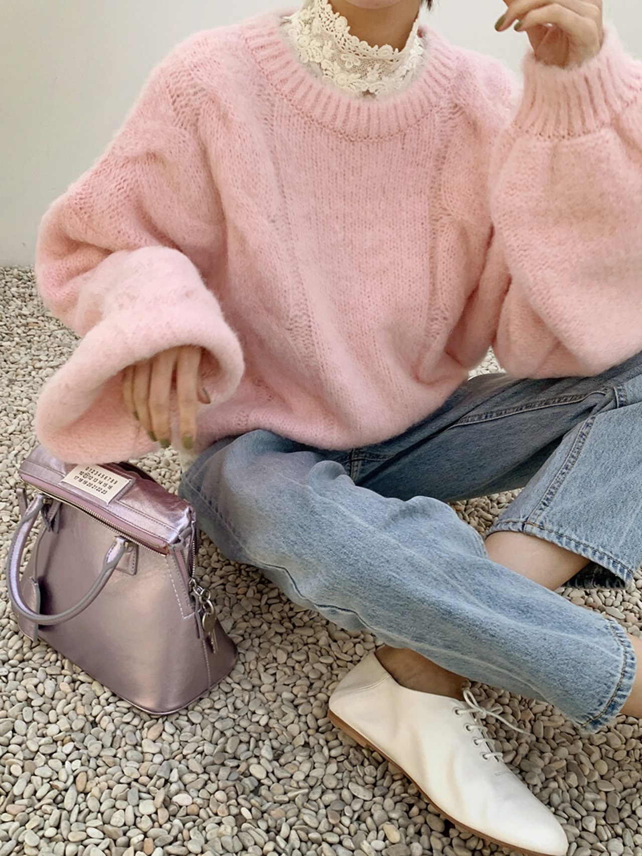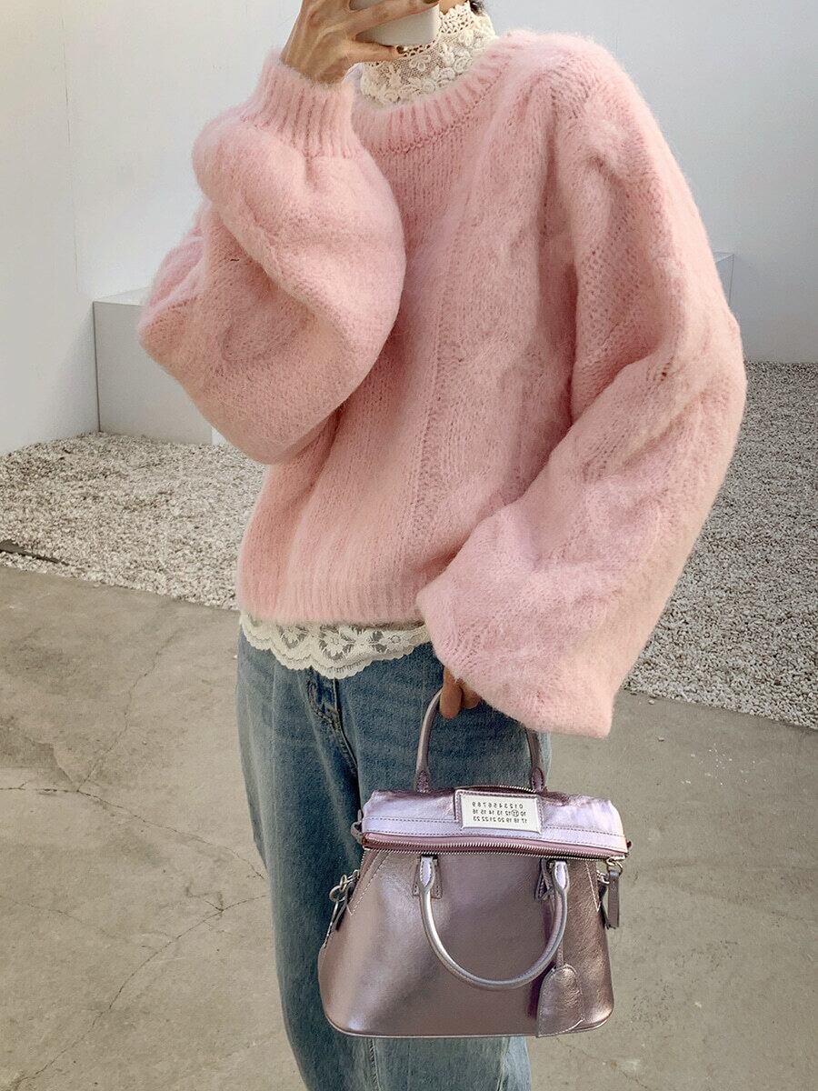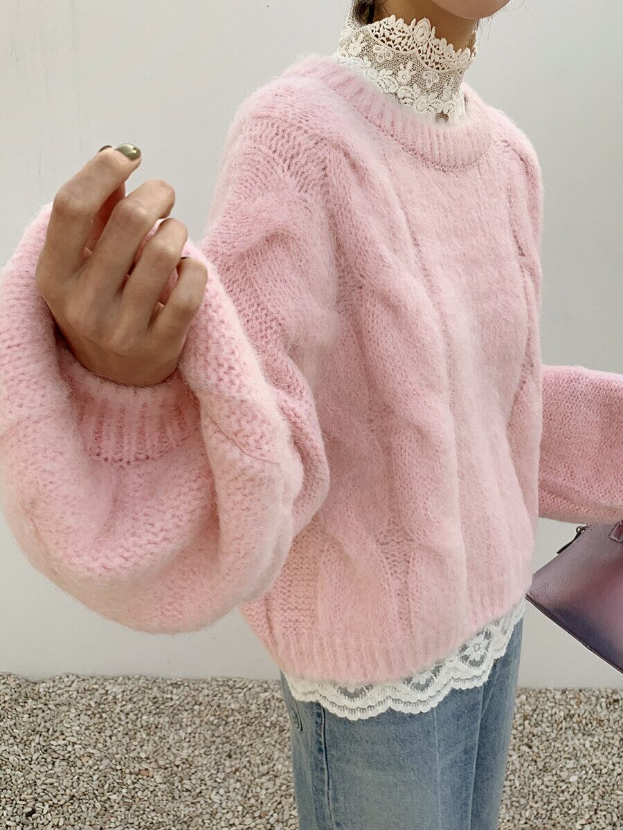 NEW秋物レースゆったりシャツ ラウンドネックルーズセーター レディース ロング 大人ガーリー スウィート キュート カジュアル オータム Oネック 長袖 muzly78285148687 | Neatly