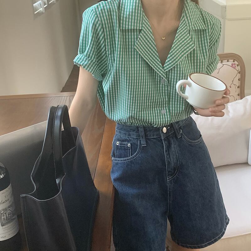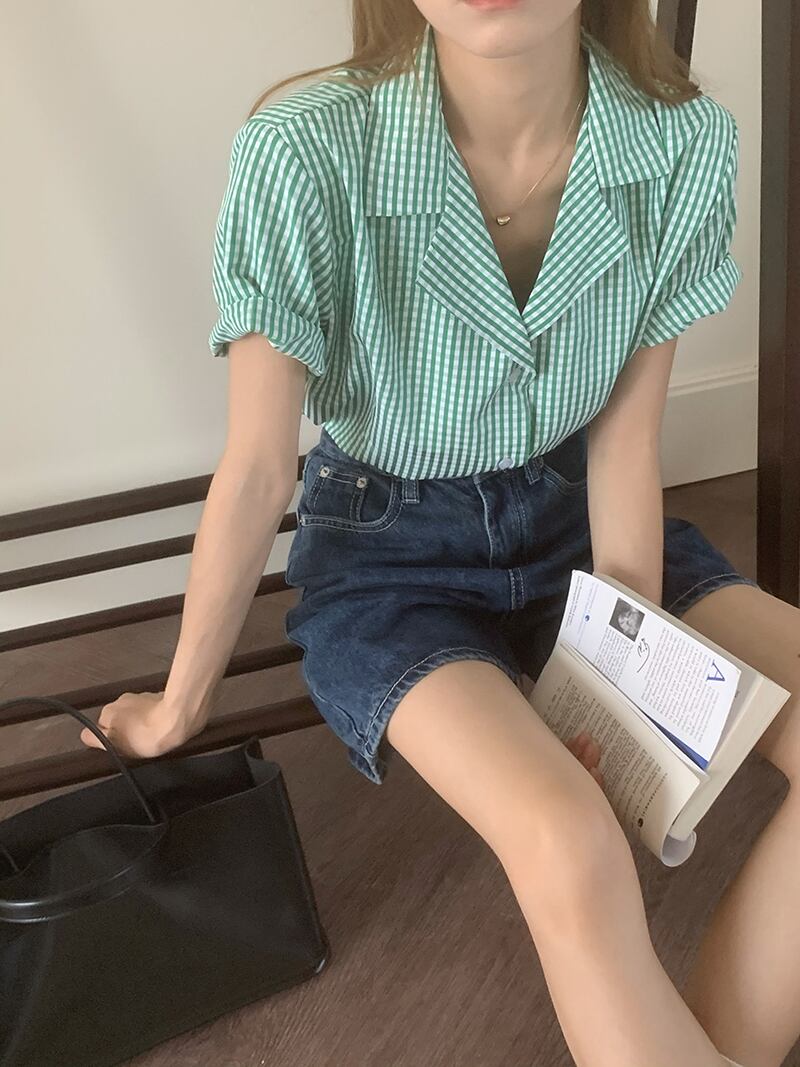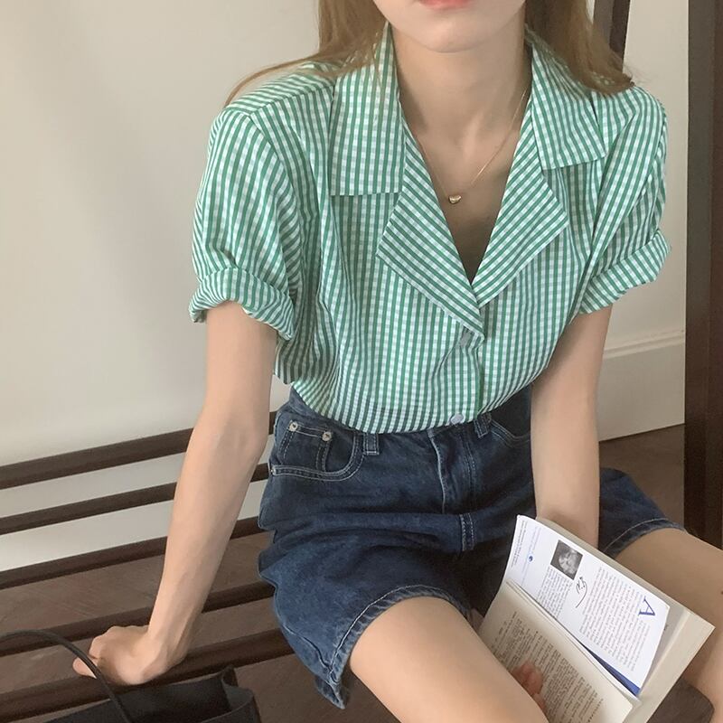 スタンダード夏服ルーズ格子柄シャツ トップス レトロ 夏物 muzly25026186475