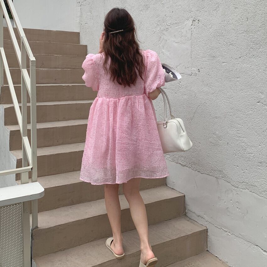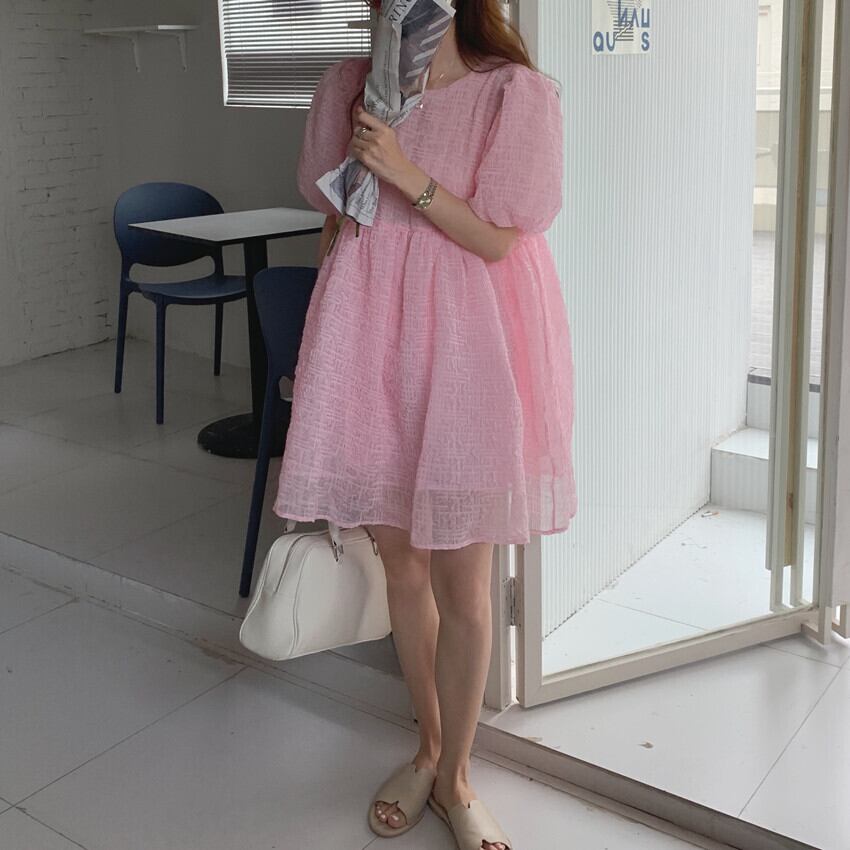 夏服ラウンドネックスリーブワンピースルーズ半袖レディース ショート ピンク ハーフスリーブ 大人ガーリー スウィート キュート カジュアル 夏物 Oネック muzly33529510851