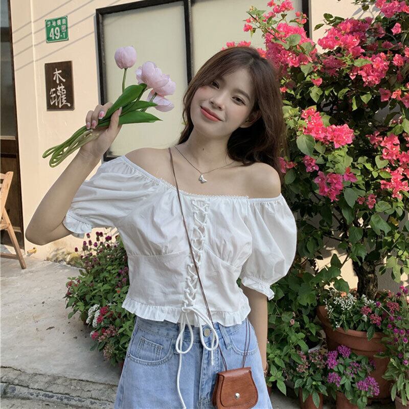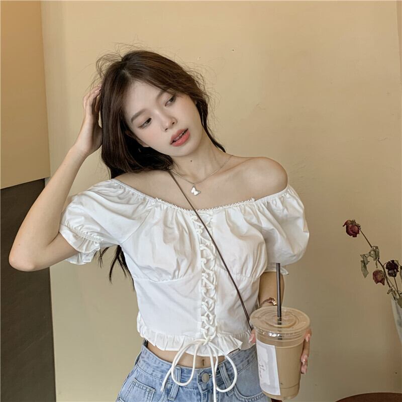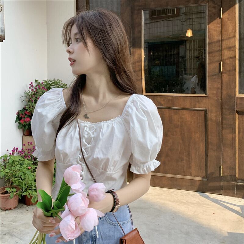 韓国ファッション夏服カラースリーブショートシャツ レディース 大人ガーリー スウィート キュート カジュアル 夏物 スクウェア muzly46614438287