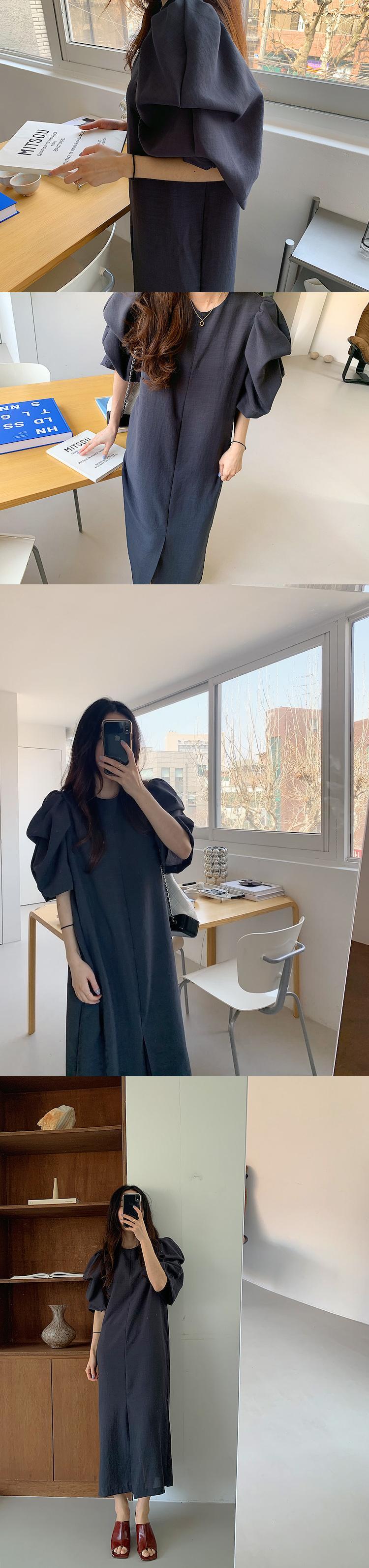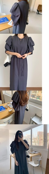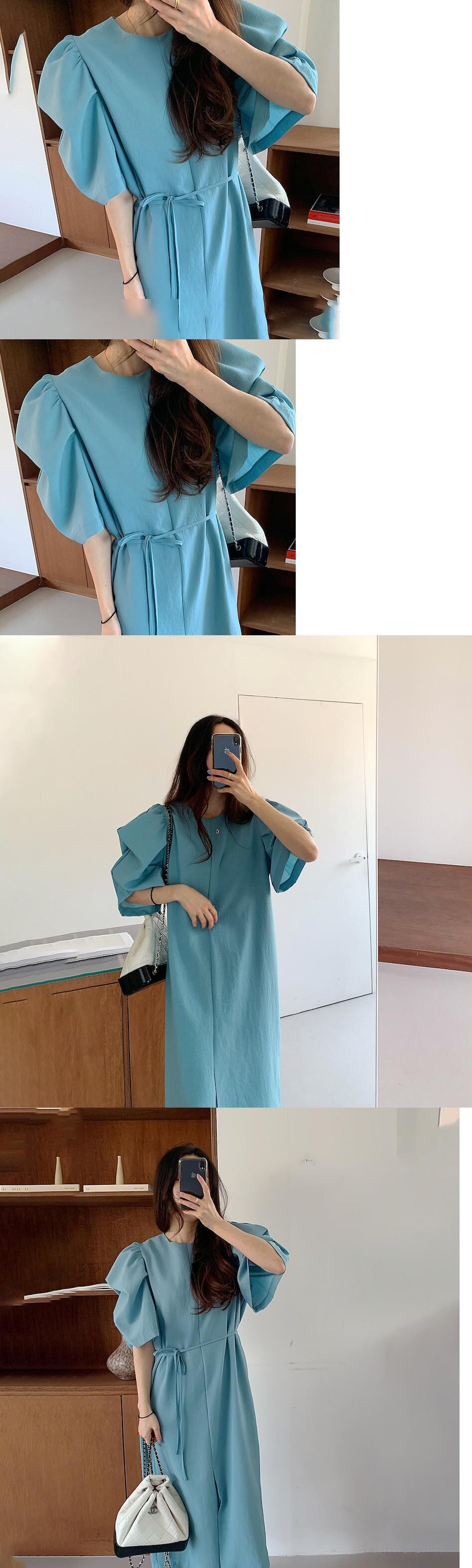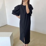 夏服ラウンドネックプリーツパフスリーブスリーブルーズロングスリットレースウェストワンピースレディース 夏物 Oネック ウエスト muzly28614018635