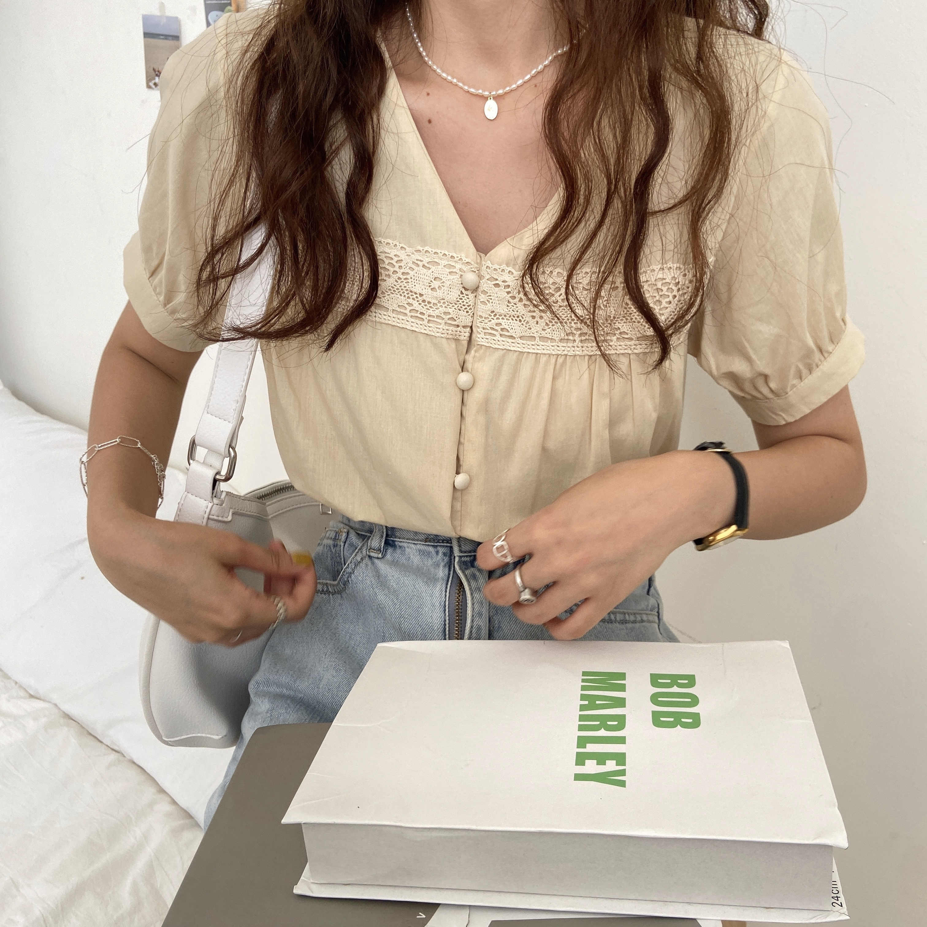 韓国ファッションNEW夏服スタンダードVネックレースルーズシャツ トップス レディース レトロ 夏物 ステッチ muzly13202966375