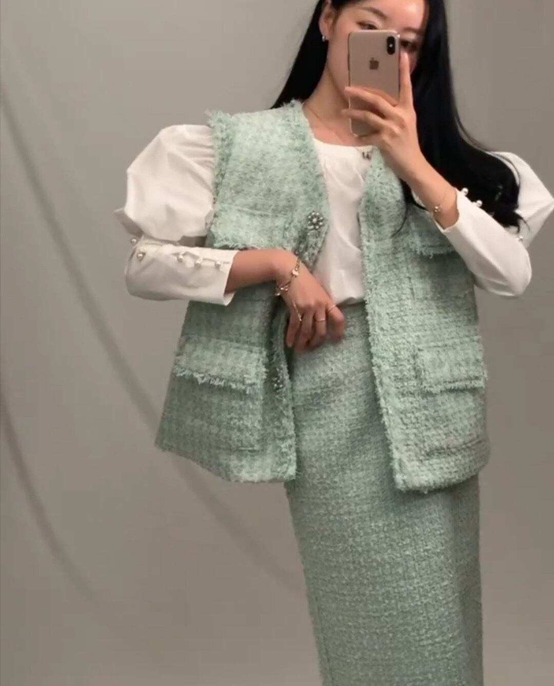 色:白のシャツ,グリーンベスト,カーキベスト,緑のスカート,カーキ色のスカート