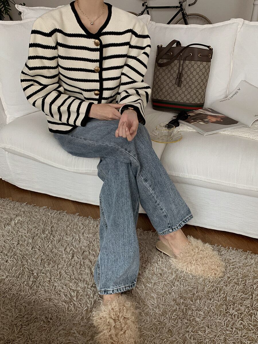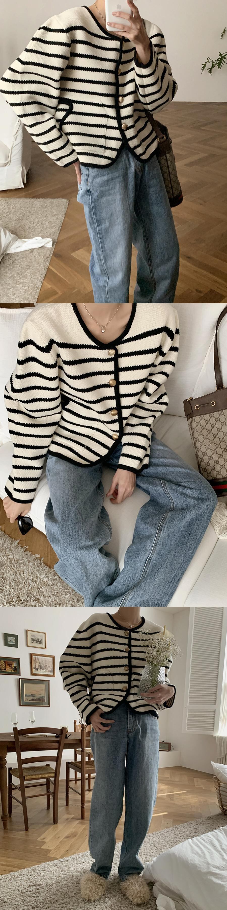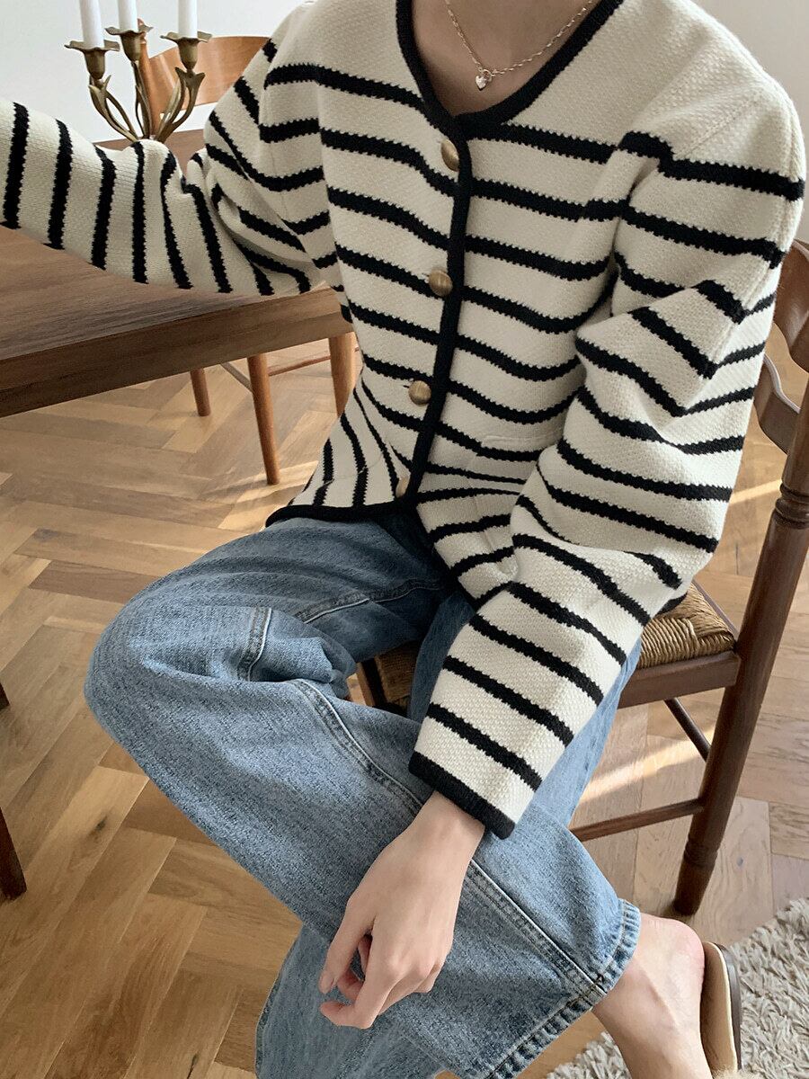 韓国ファッション秋物ウィンタースタンダードラウンドネックカーディガンシャツ ルーズ薄手ストライプセーター ロング レトロ オータム 冬物 Oネック 長袖 muzly11115826850 | Neatly