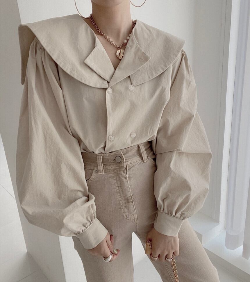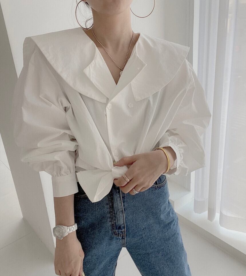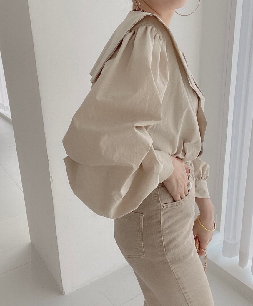 秋物スタンダードネイビーカラースリーブシャツ ルーズフローラルトップス ロング レトロ オータム 花柄 長袖 muzly68526775944