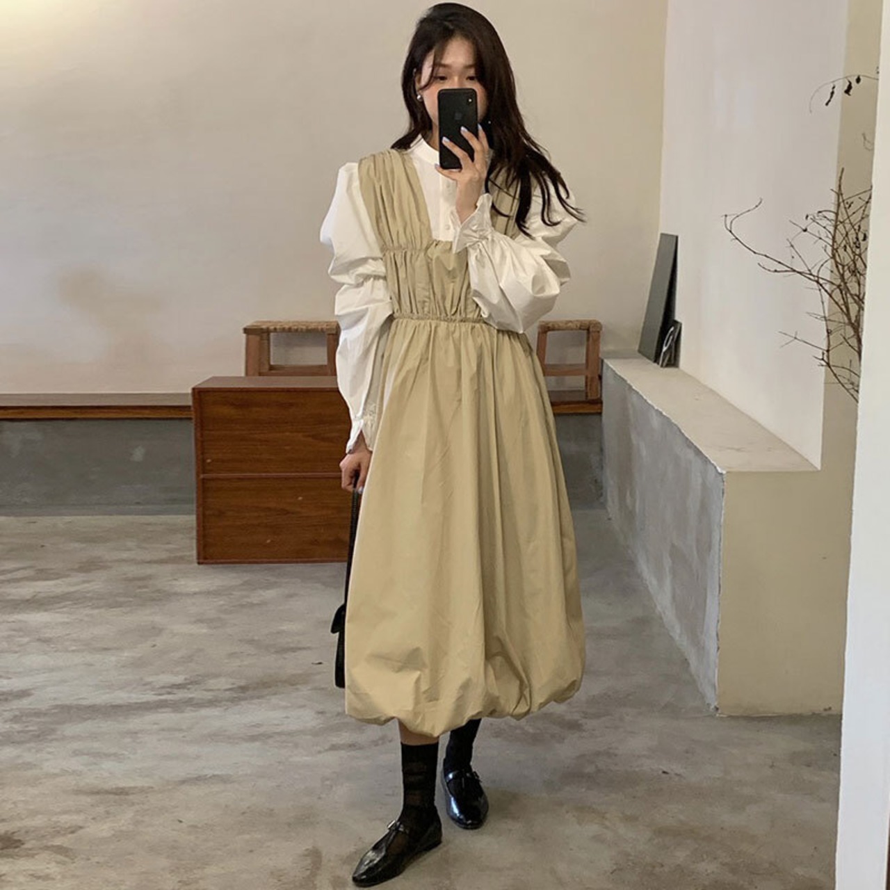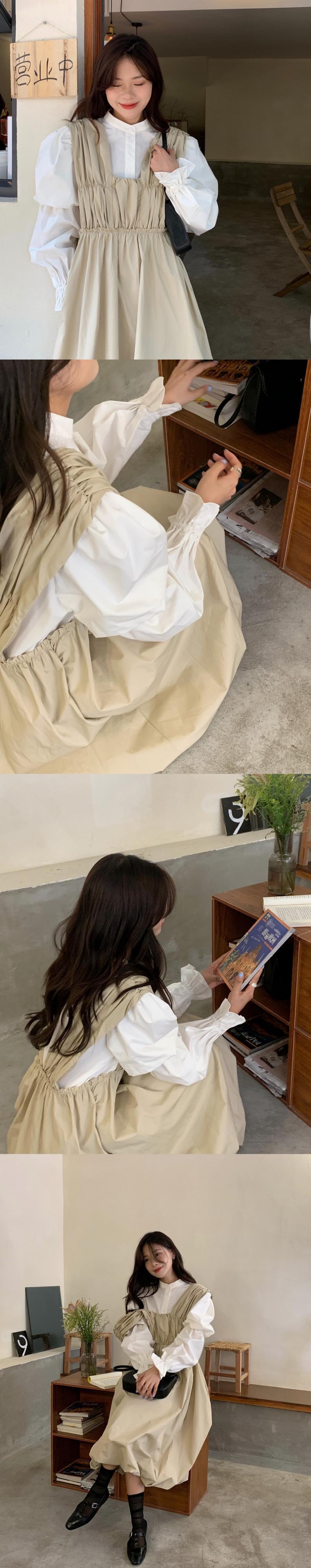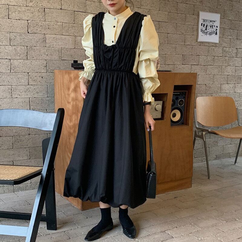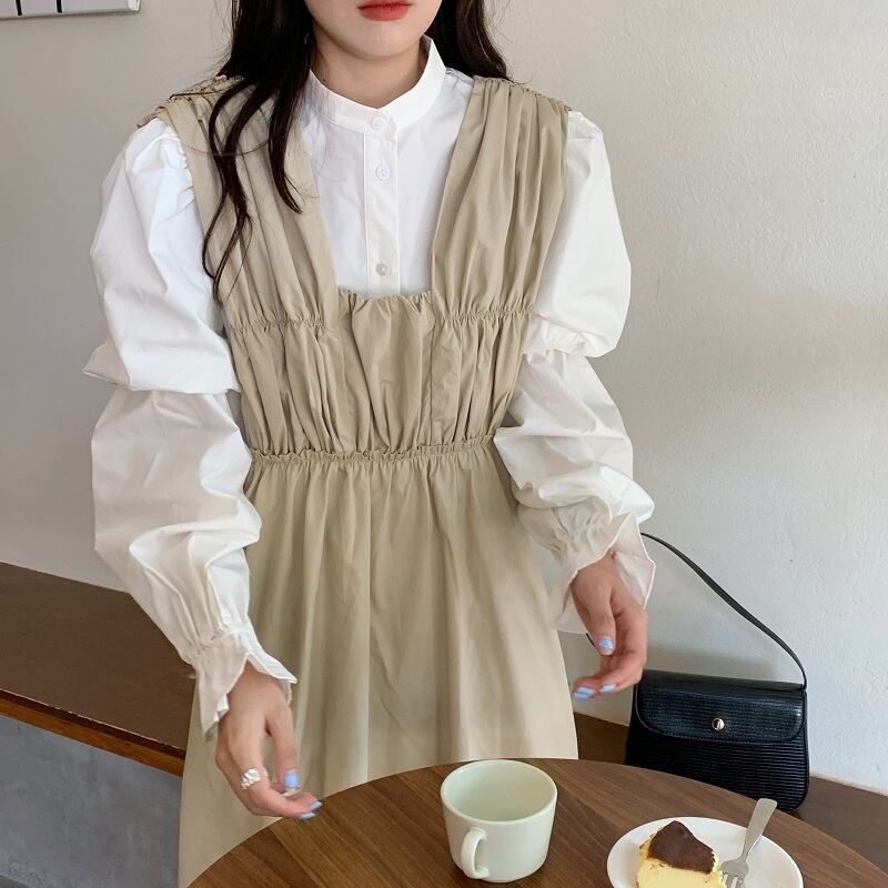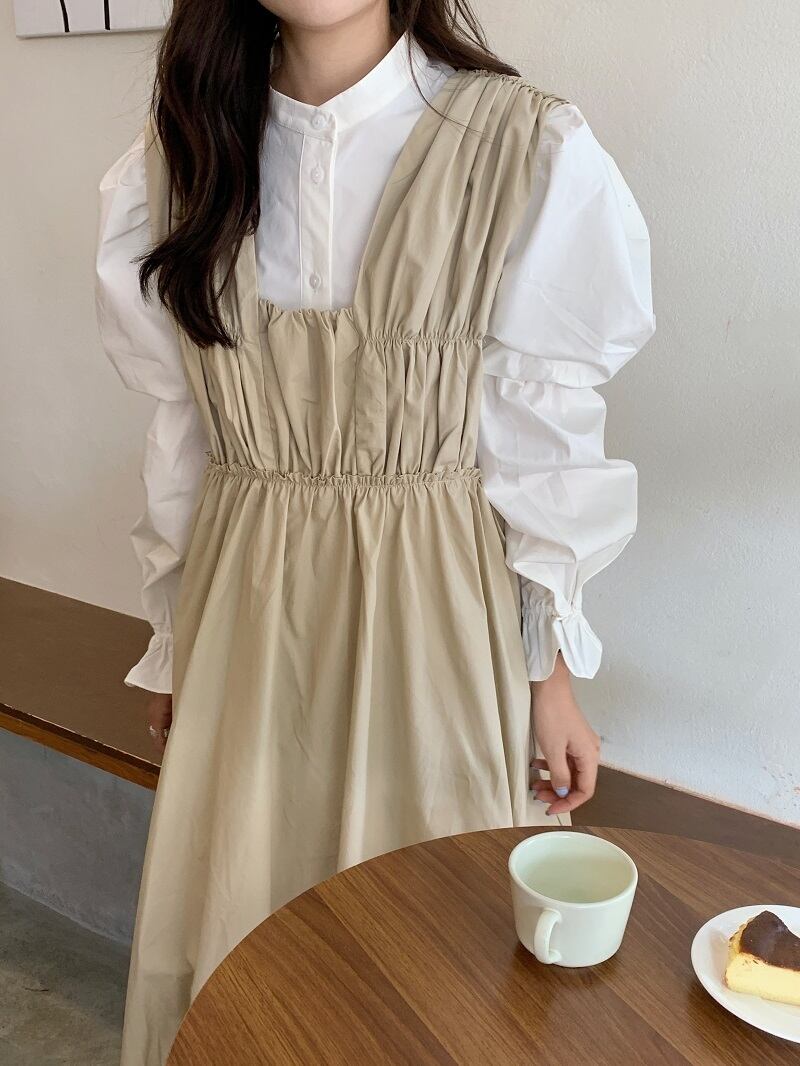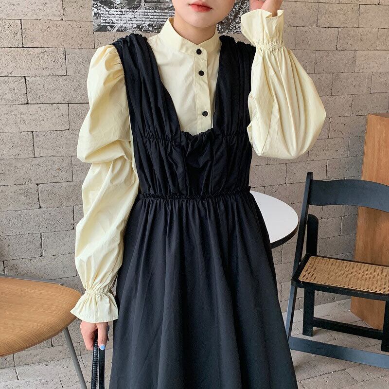 色:白のシャツ,黄色のシャツ,アプリコットベスト,黒のタンクスカート