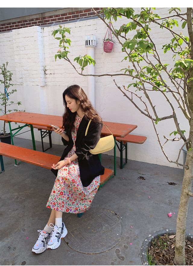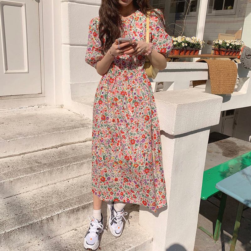 韓国ファッション夏服スタンダードラウンドネックスリーブフローラルワンピースルーズロング半袖レディース ショート レトロ ハーフスリーブ 夏物 花柄 Oネック muzly24380431761