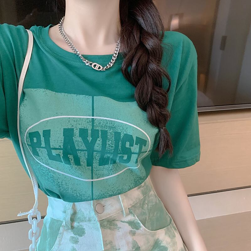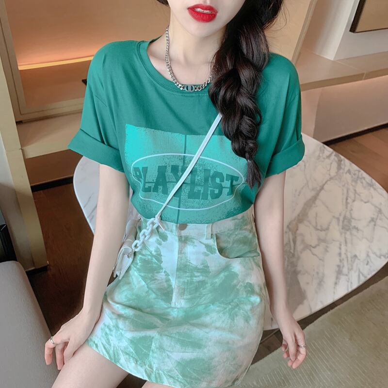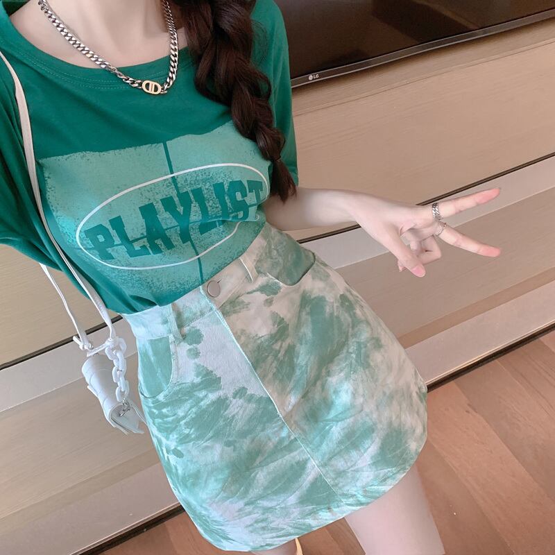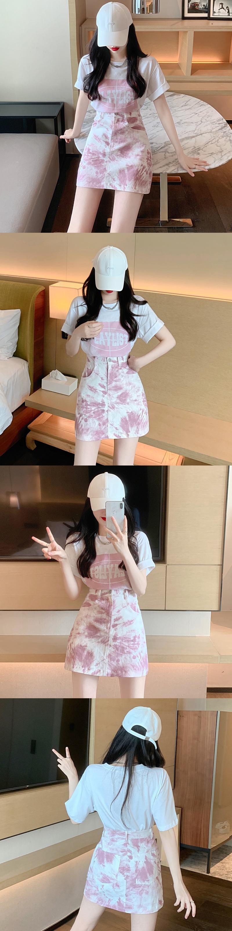 色:ホワイトプリントTシャツ,ダークグリーンのプリントTシャツ,ホワイトピンクのスカート,白と緑のスカート