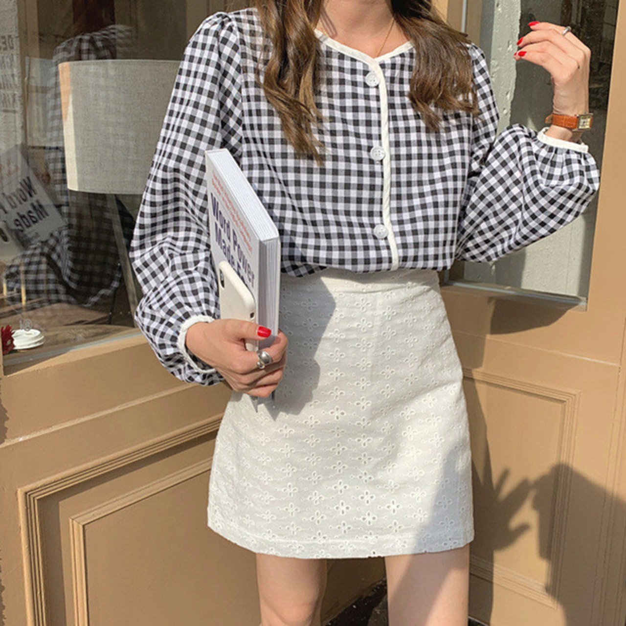 スプリングカラーラウンドネックスリーブカーディガンシャツ ルーズ格子柄 ロング 春物 Oネック 長袖 muzly41187507101