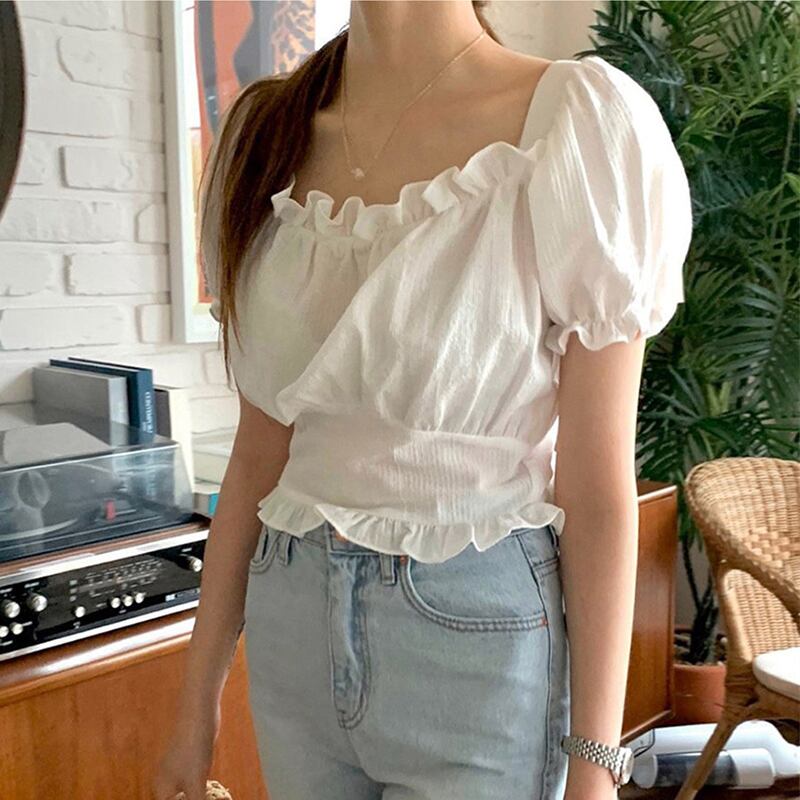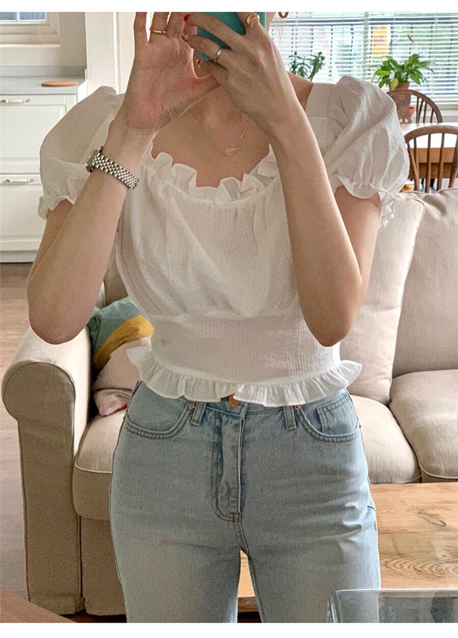 韓国ファッション夏服カラースリーブショートトップス ハイウェストウェスト半袖シャツ レディース ハーフスリーブ 大人ガーリー スウィート キュート カジュアル 夏物 スクウェア ウエスト muzly91225182647 | Neatly