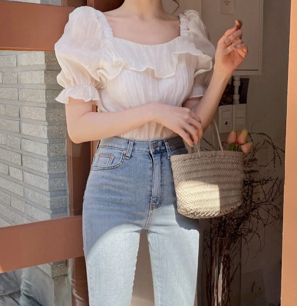 韓国ファッションスリーブカラースリム半袖シャツ レディース ショート ハーフスリーブ 大人ガーリー スウィート キュート カジュアル ピュア スクウェア muzly96333743401