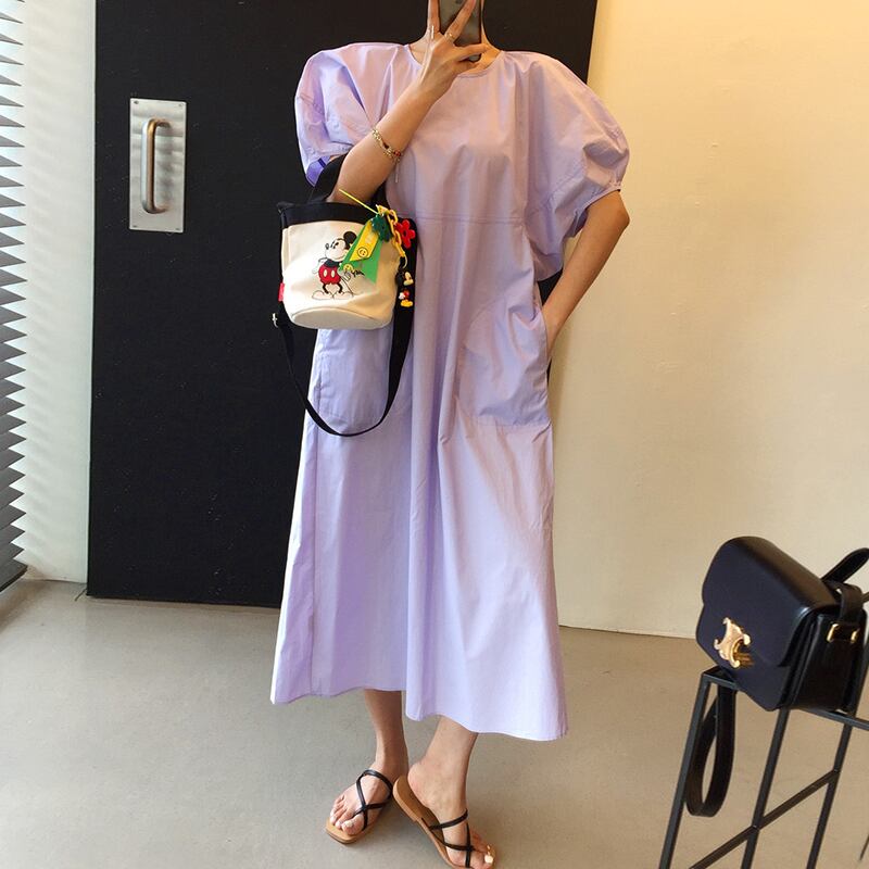 夏服ラウンドネックルーズロングダブルソリッド カラーカジュアルミニ ワンピースワンピースレディース ランタンスリーブ 夏物 Oネック ソリッドカラー muzly33132923108