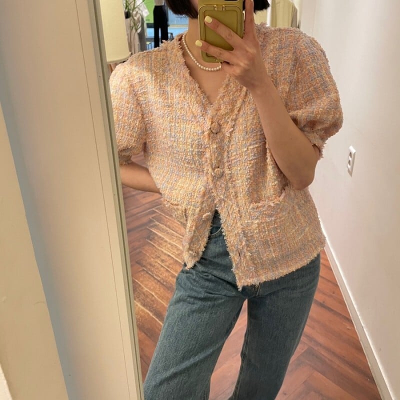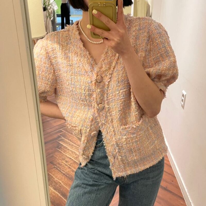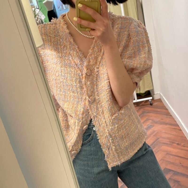 NEW夏服Vネックスリーブカーディガンツィードジャケット トップス 夏物 muzly70483037014