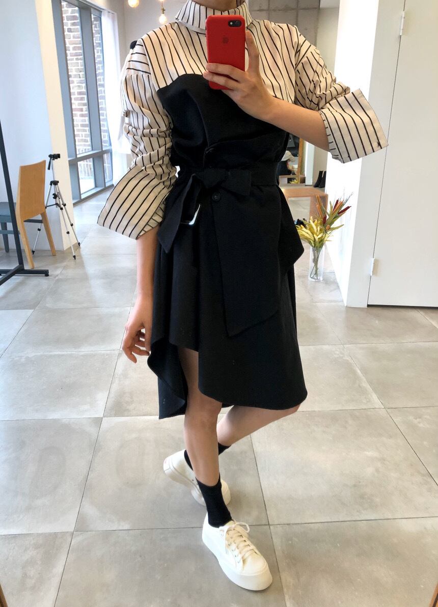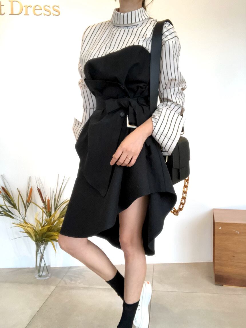 韓国ファッション秋物スタイルカラーストライプレースウェスト長袖スリーブワンピースレディース ロング オータム ステッチ ウエスト muzly77498376978