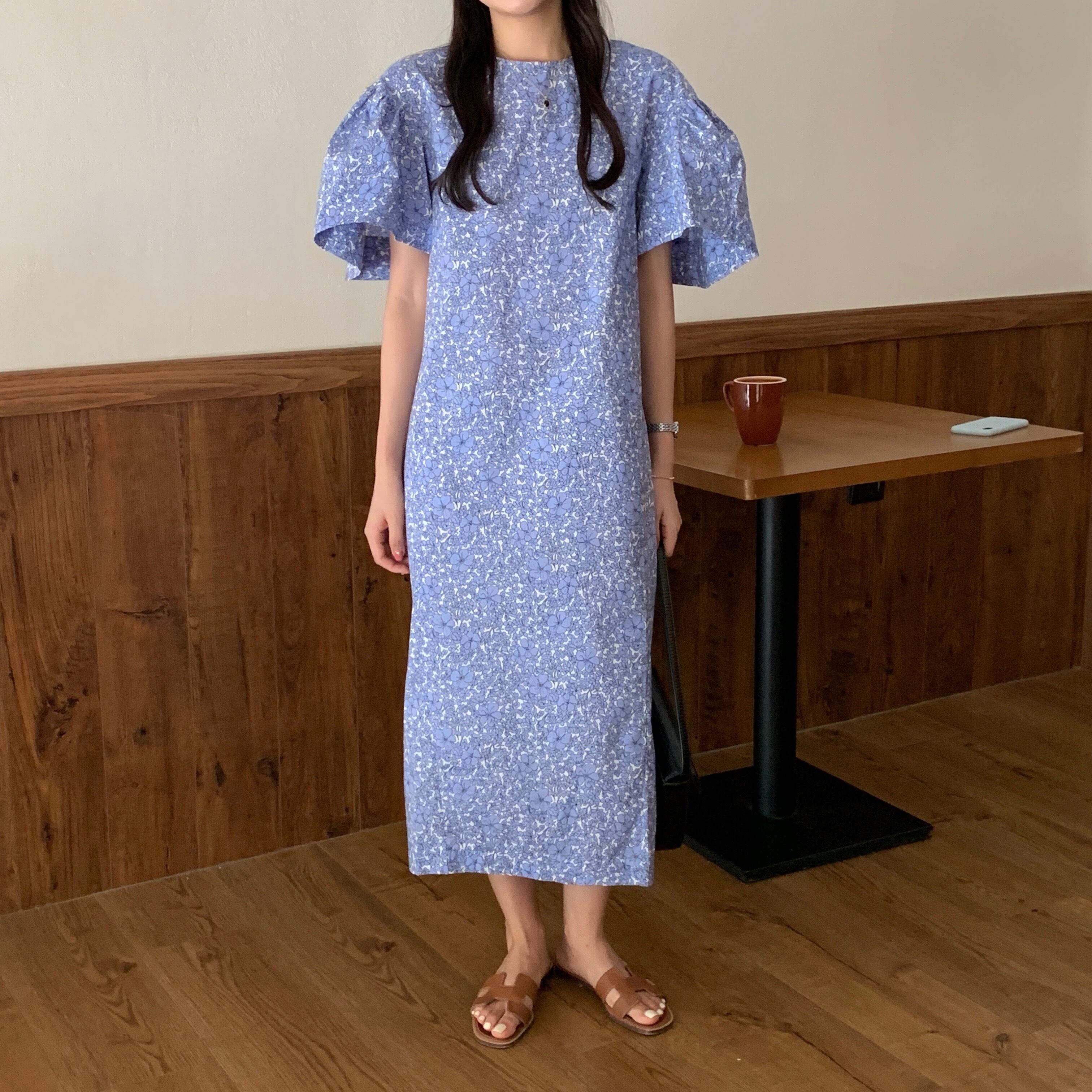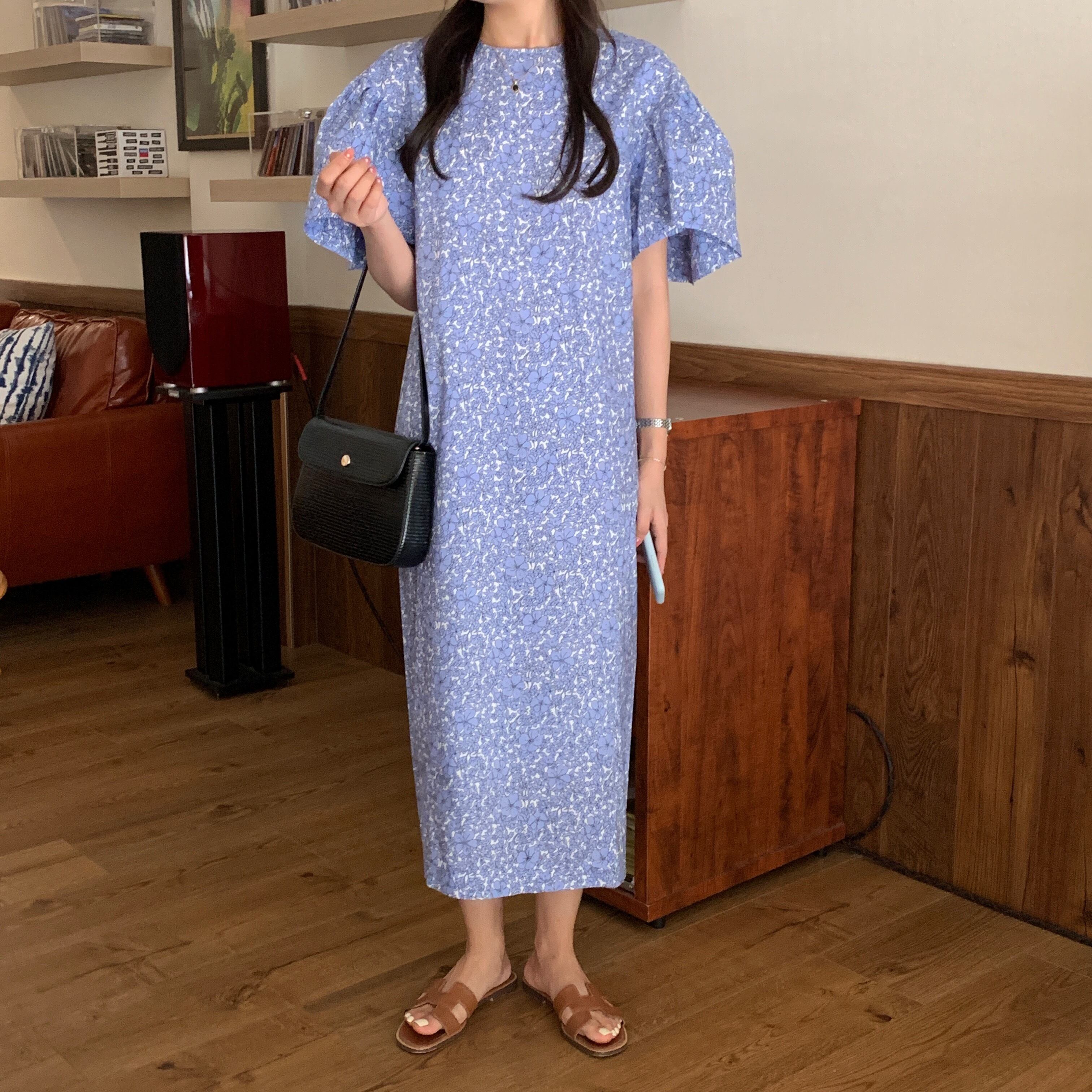 スタンダードラウンドネックスリーブロングスカート 夏服ルーズ薄手フローラルワンピース レトロ 夏物 花柄 Oネック muzly302233805