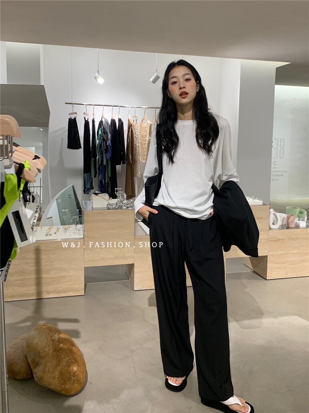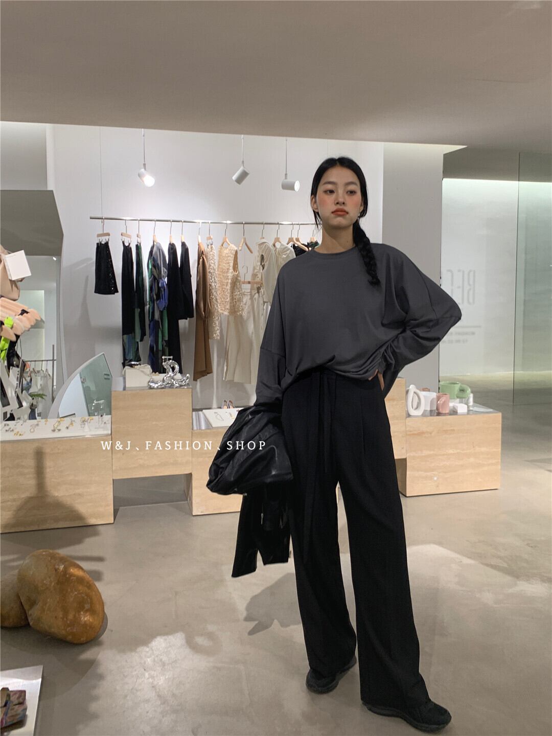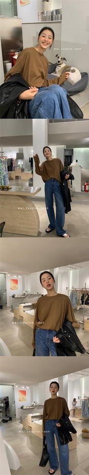 韓国ファッションNEW秋物ベーシックカラールーズゆったりシャツ ラウンドネック長袖スリーブTシャツトップス レディース ロング オータム Oネック ピュア muzly66140189196 | Neatly