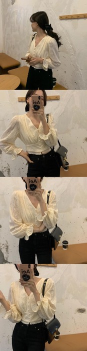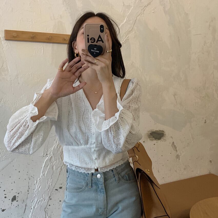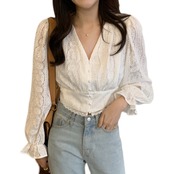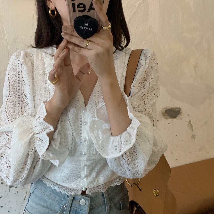 韓国ファッションNEWスプリングVネックスリーブレーススリムシャツ トップス レディース ロング 春物 長袖 muzly98204163982