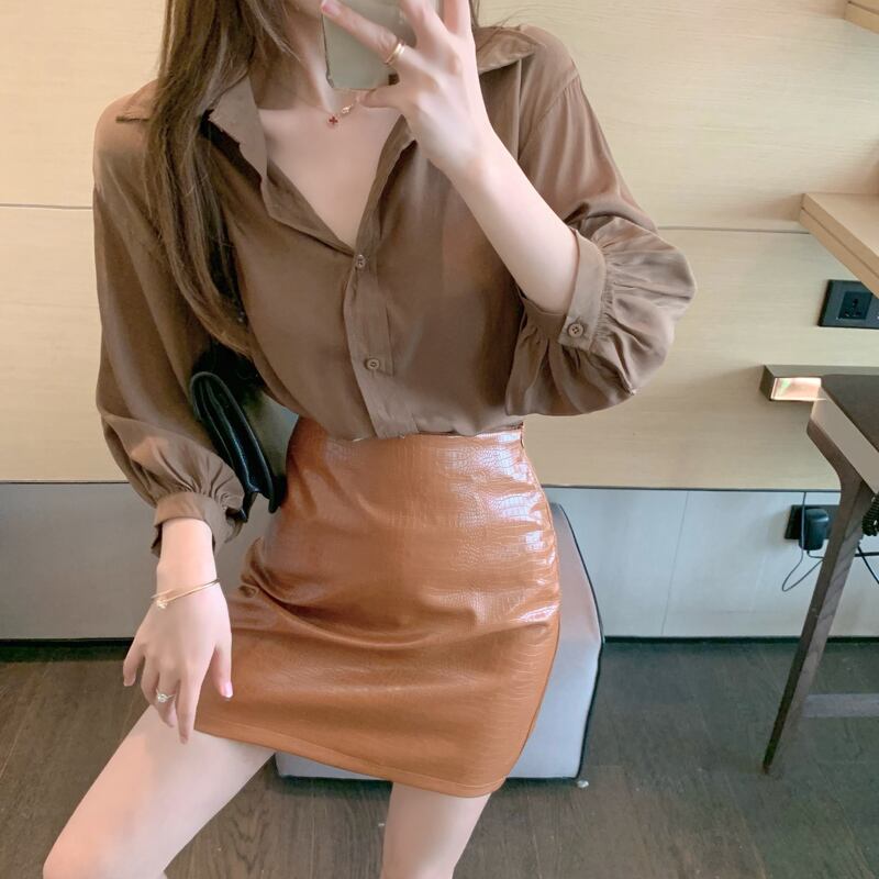 色:コーヒーシャツ,茶色のスカート