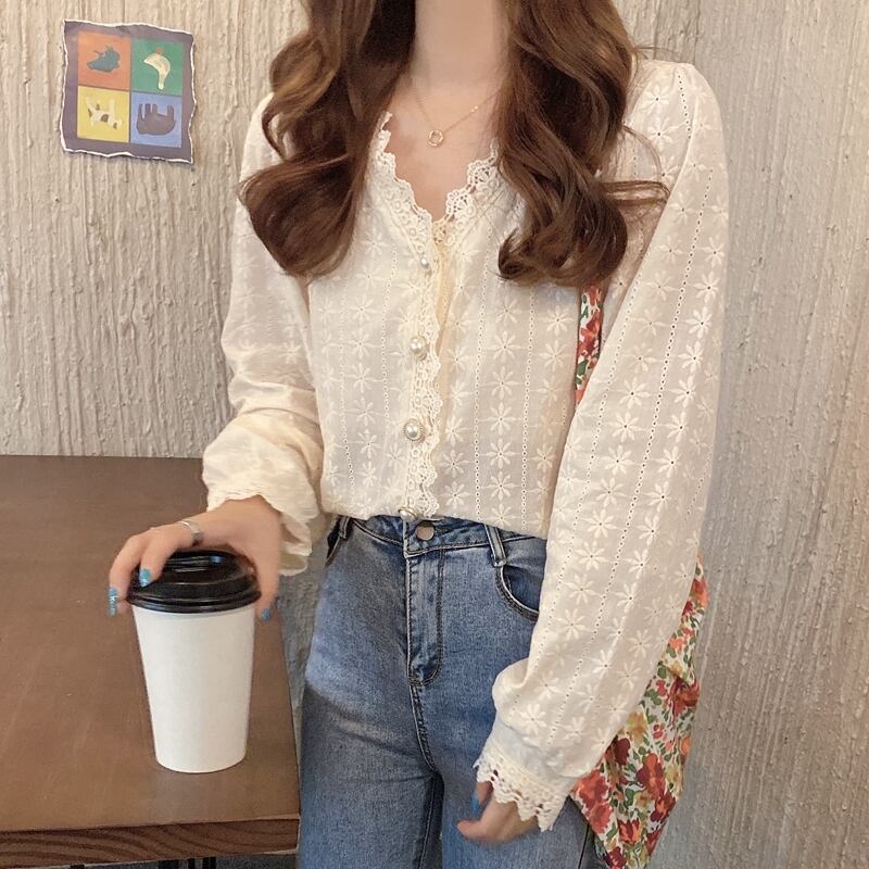 秋物スタンダードVネックレースゆったりブラウス スタイルFlowerデザイン シャツ レディース ロング レトロ オータム フラワーデザイン 長袖 mengruling43119555543 | Neatly