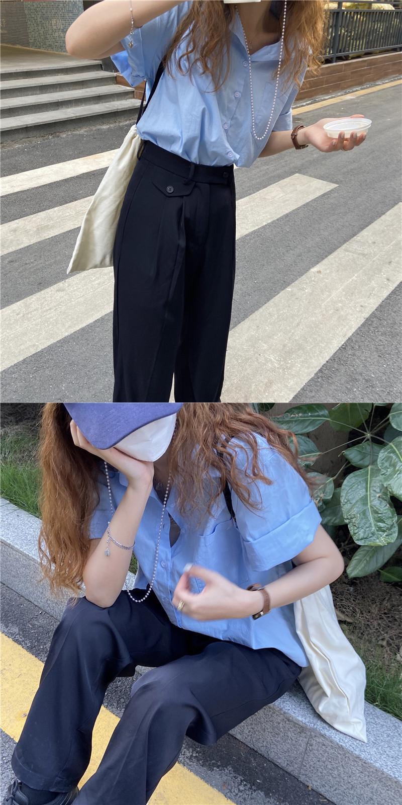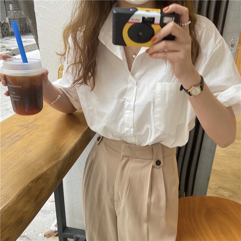 夏服ホワイトブルールーズショートカジュアルシャツ トップス レディース 夏物 muzly51354115352
