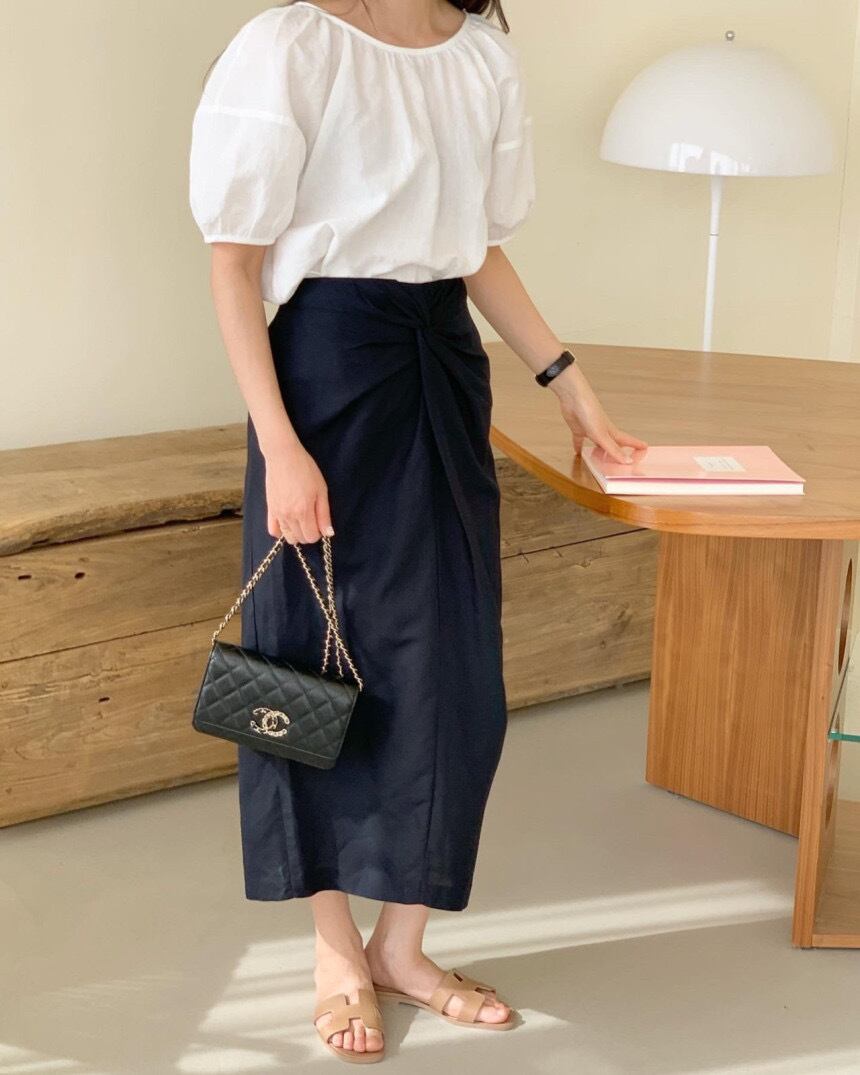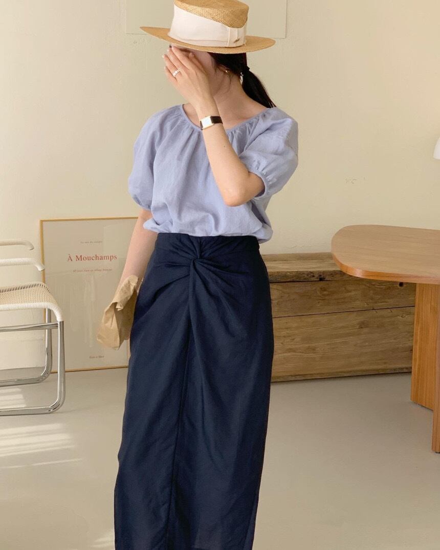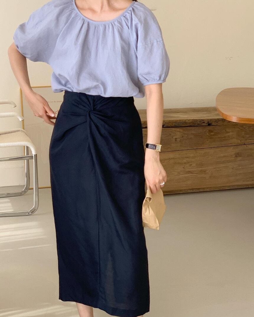 NEW夏服パフスリーブスリーブラウンドネックシャツ ハイウェストウェストロングスカート 夏物 Oネック ウエスト muzly19639533