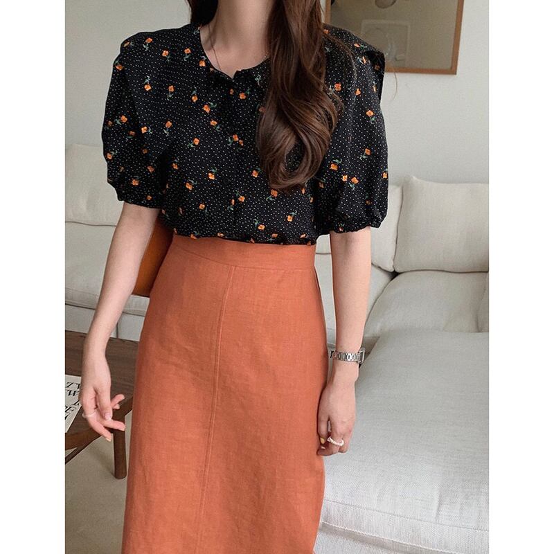 韓国ファッションNEW夏服カラーフローラルスリーブシャツ ハイウェストウェストスカート 夏物 花柄 ウエスト ミドル丈 muzly44733871931