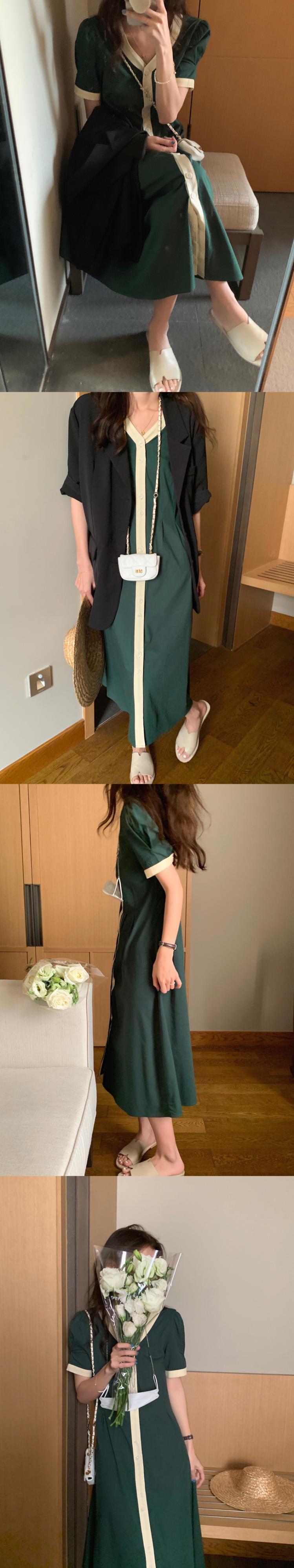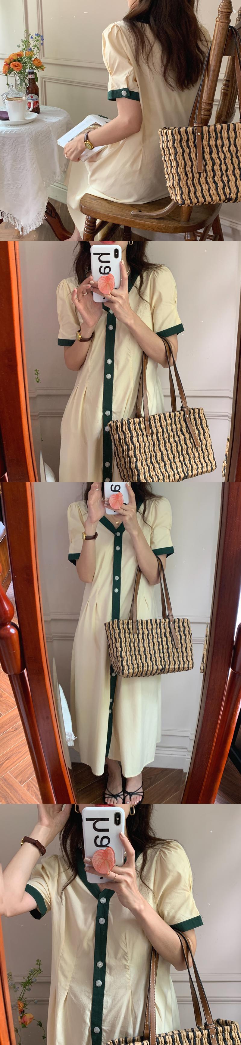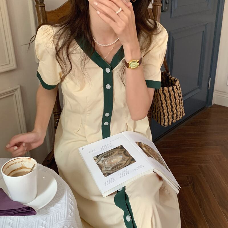 NEW夏服スタンダードカラーVネックルーズ薄手ミニ ワンピースワンピースレディース レトロ 夏物 ステッチ パフスリーブ muzly89734762113