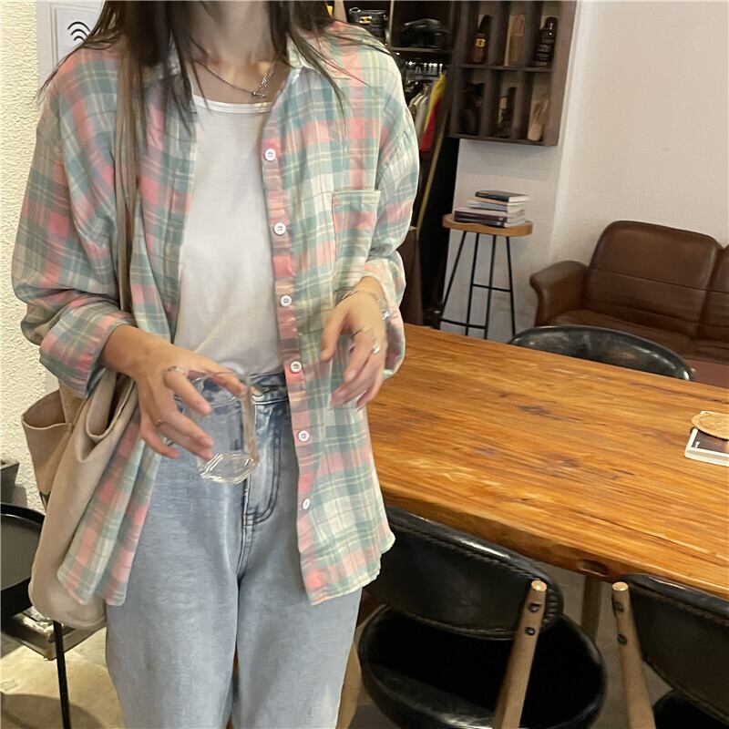韓国ファッション夏服スタンダードシャツ ルーズ格子柄 ロング レトロ 夏物 長袖 muzly82090426360