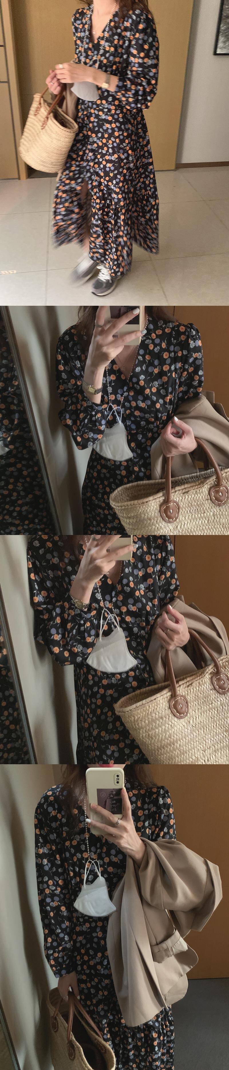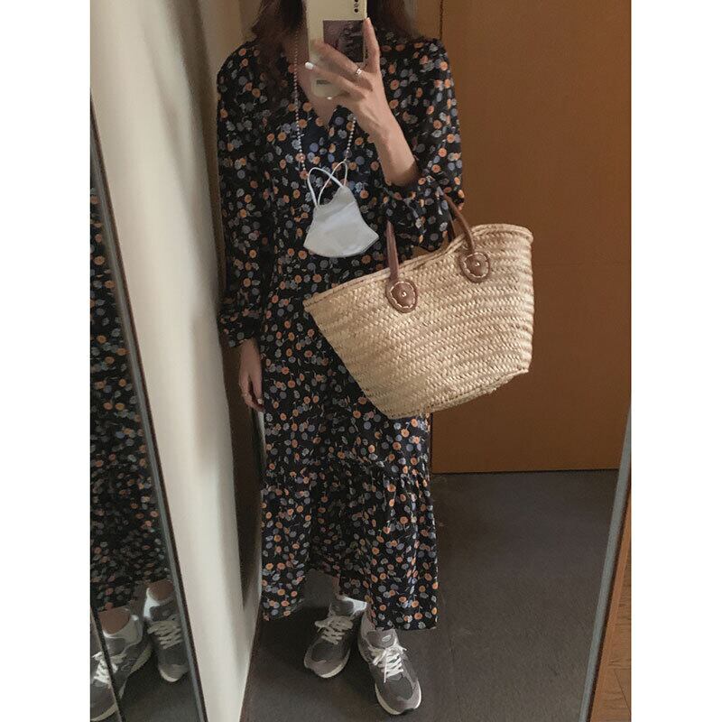 韓国ファッションNEW秋物スタイルスタンダードVネックシフォンロングスカート ルーズ薄手フローラルワンピースレディース レトロ オータム 花柄 長袖 muzly46266398984 | Neatly