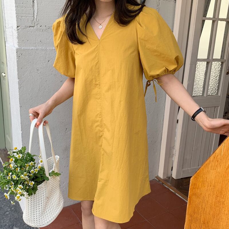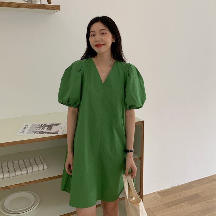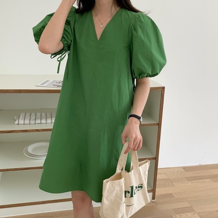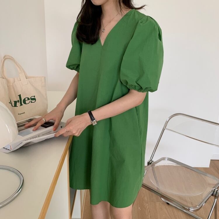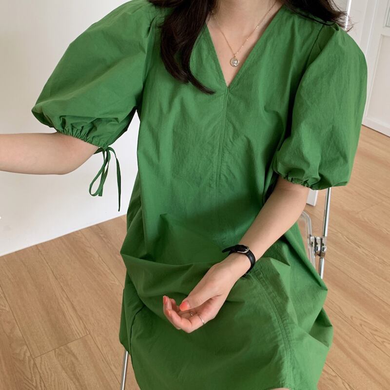 NEW夏服スタンダードVネックルーズギャザーミニ ワンピースワンピース レトロ 夏物 パフスリーブ muzly10015706136