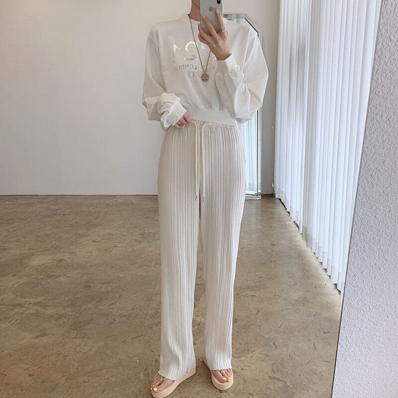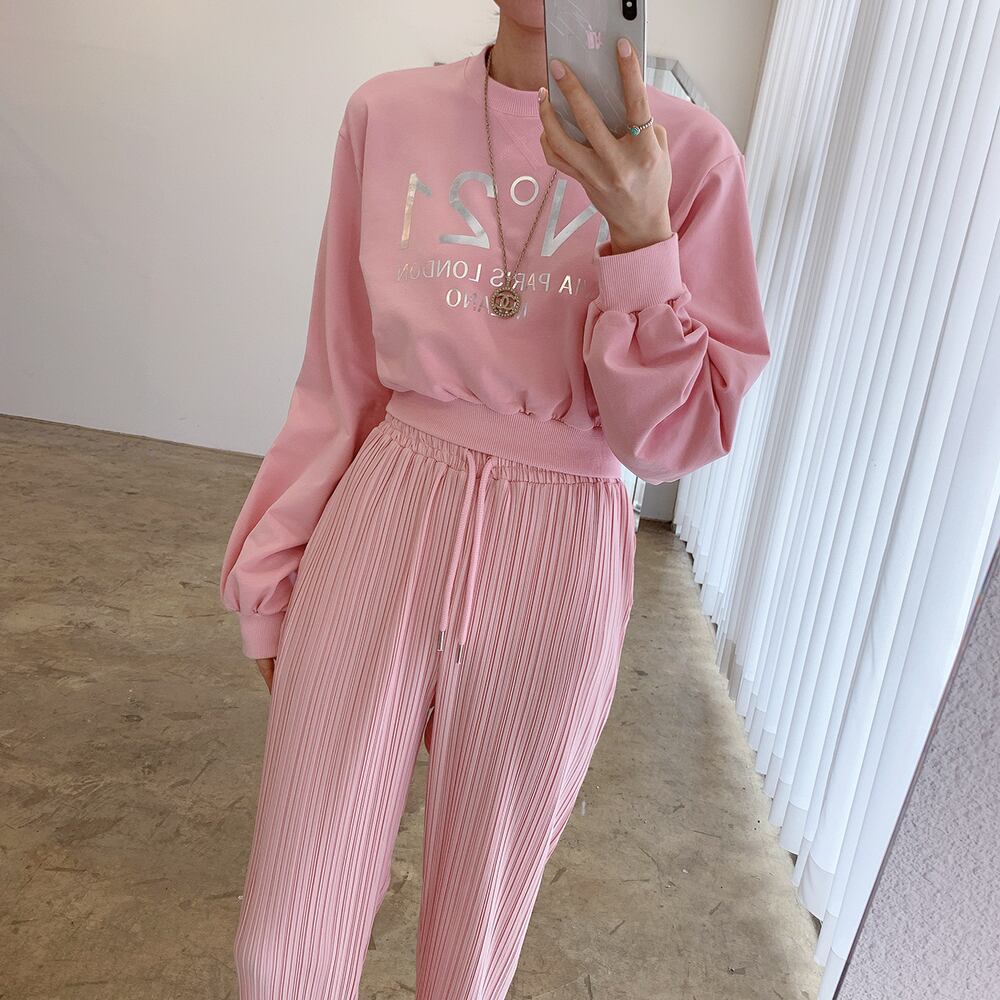 韓国ファッションNEW秋物カジュアルラウンドネックプリントショートセーター ハイウェストパンツ レディース ロング オータム Oネック 長袖 ウエスト muzly18522403273 | Neatly