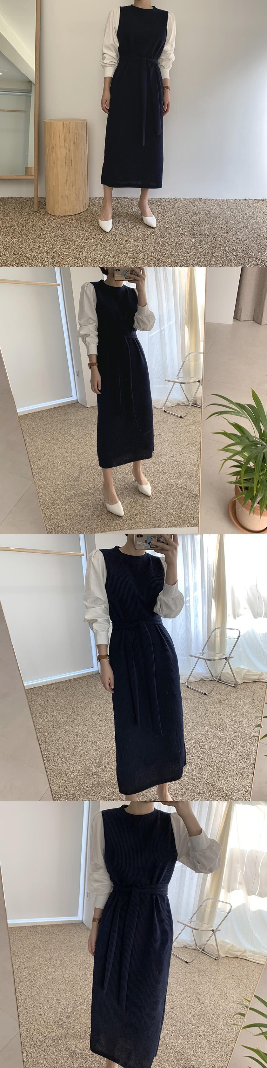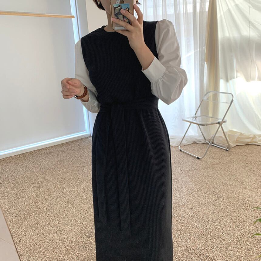 韓国ファッションスタンダードラウンドネックカラーニットロングスカート ウェストワンピース秋物 レトロ レース オータム Oネック レースアップ ステッチ 長袖 ウエスト muzly23693840473 | Neatly