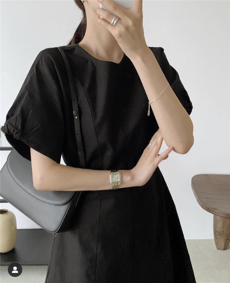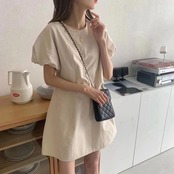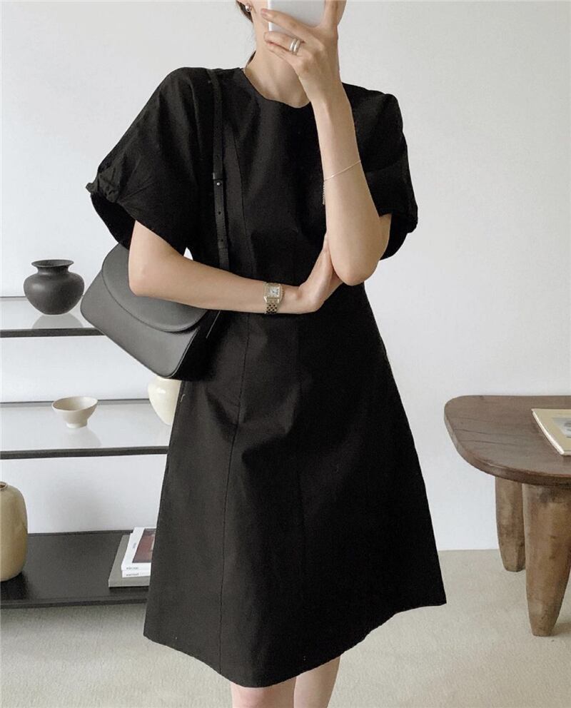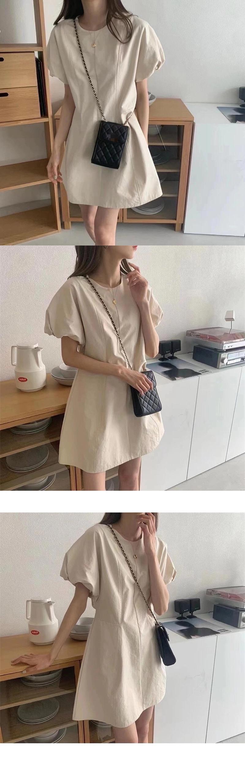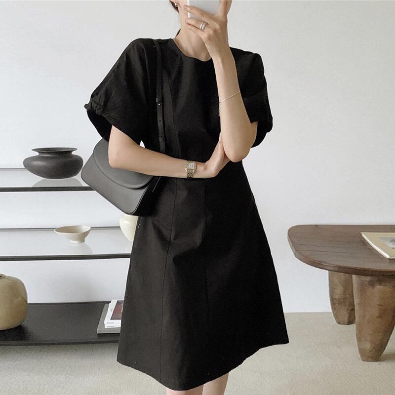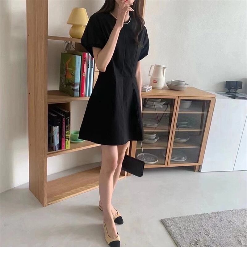 夏服ラウンドネックソリッド カラーパフスリーブスリーブショートスカート ウェストスリム半袖ワンピース ハーフスリーブ 夏物 Oネック ソリッドカラー ウエスト muzly12336113184 | Neatly