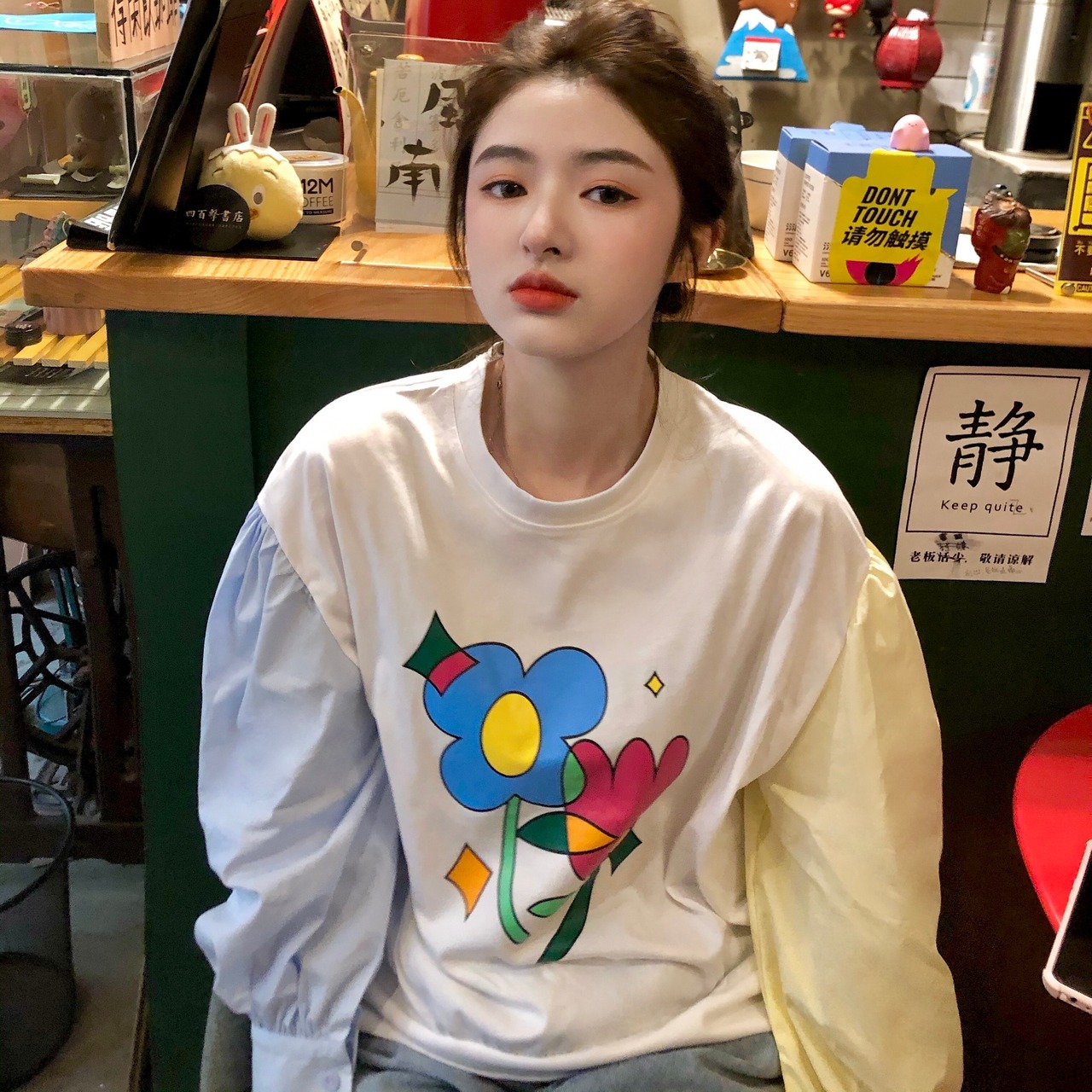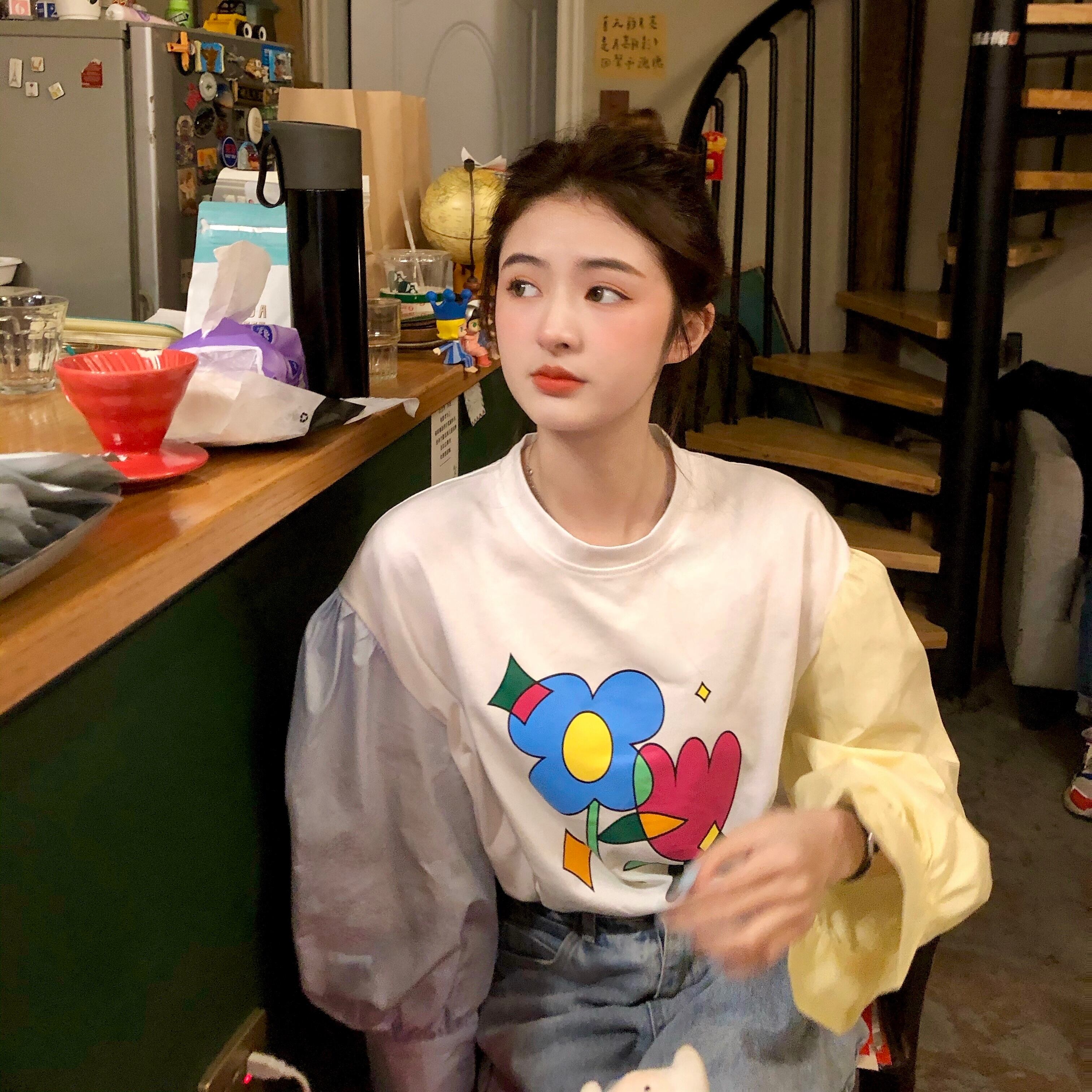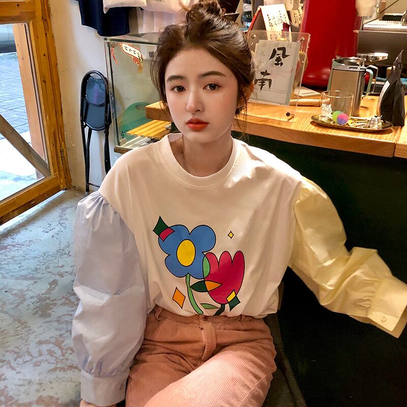 韓国ファッションNEWスプリングカラーFlowerデザイン プリント柄ルーズスリーブTシャツレディース 大人ガーリー スウィート キュート カジュアル 春物 フラワーデザイン ステッチ muzly45945124783