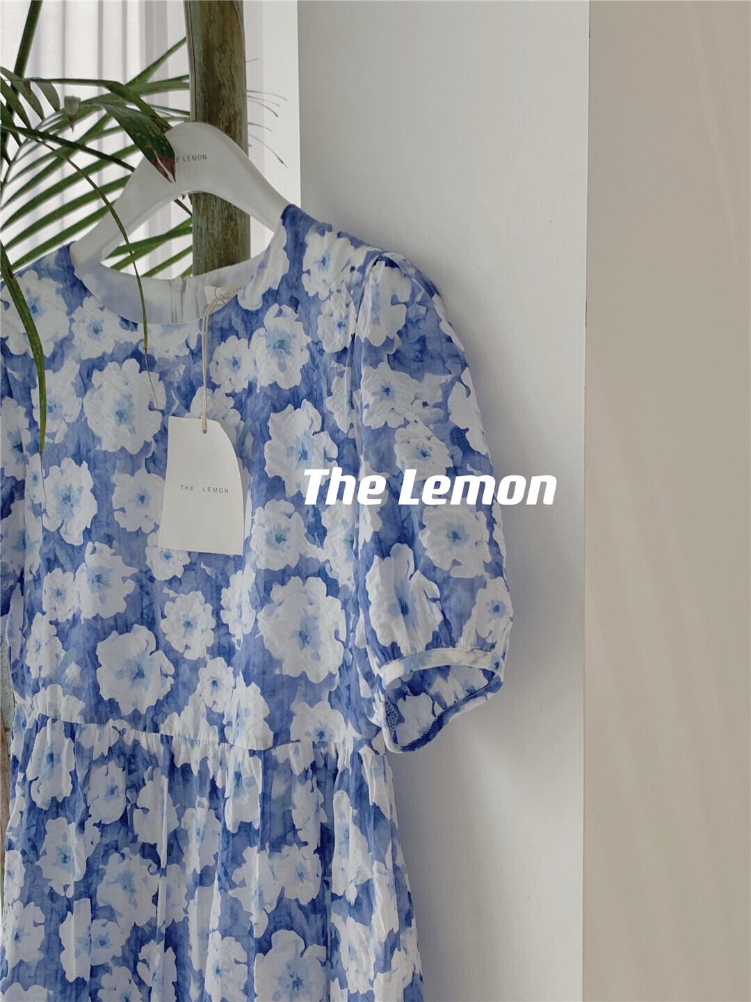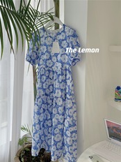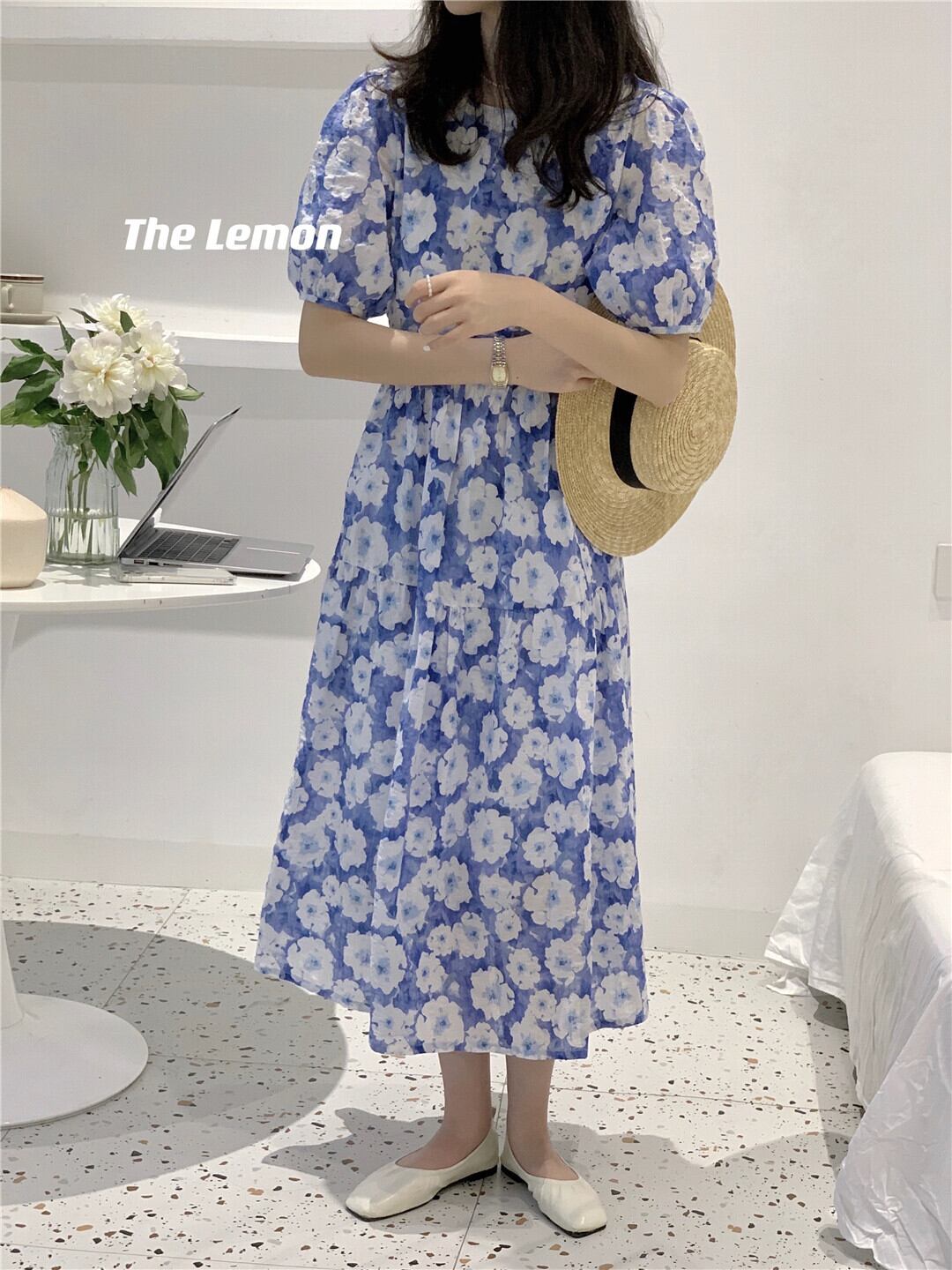 韓国ファッション夏服ラウンドネックスリーブフローラルロングスカート ウェストシフォンワンピース 夏物 花柄 Oネック ウエスト muzly34627531971