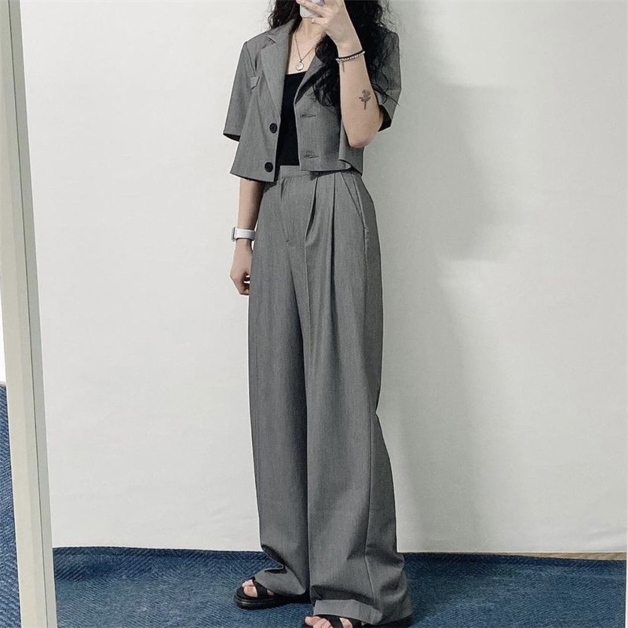 色:ブラックトップ,グレートップ,黒いズボン,グレーパンツ