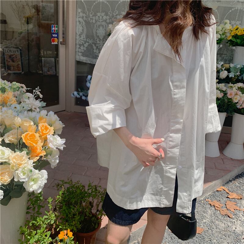 韓国ファッションホワイトルーズプリーツラウンドネックシャツ トップス レディース ロング Oネック 長袖 muzly59895695885